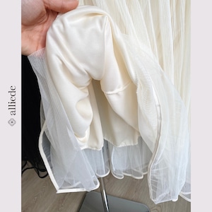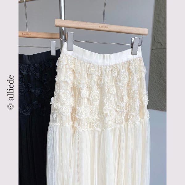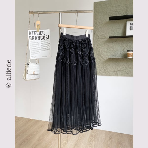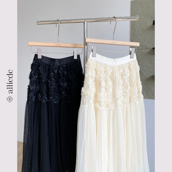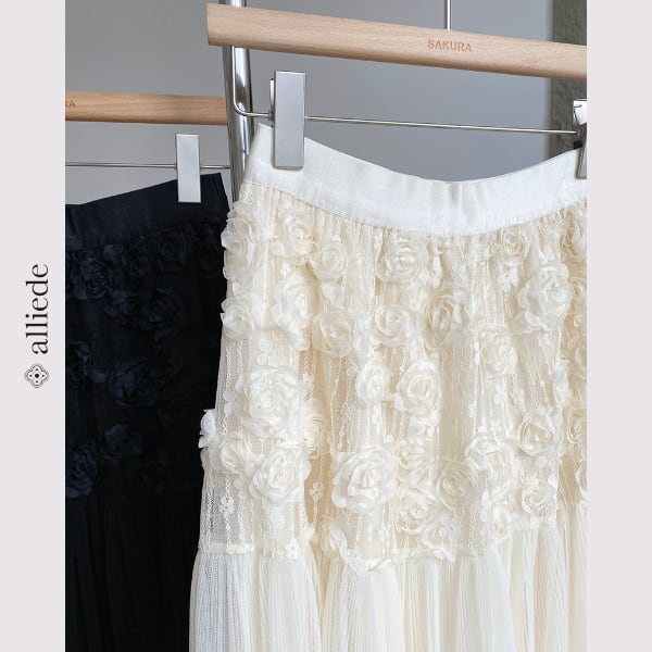 立体的なフラワーモチーフを贅沢にあしらったチュールスカート。軽やかな透け感が上品で、歩くたびにふんわり揺れるデザイン。華やかさと女性らしさを演出する一枚です。