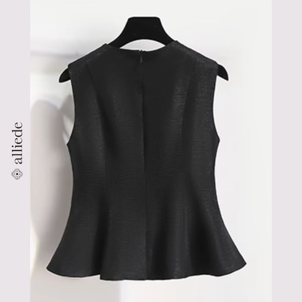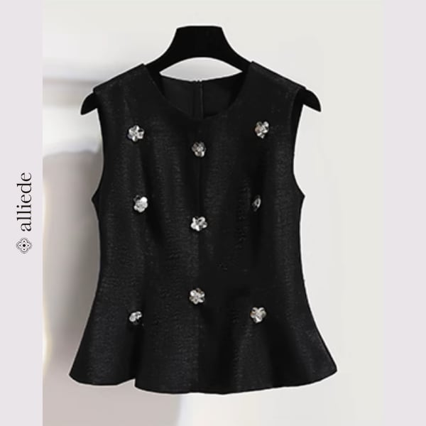 立体フラワーモチーフが華やぐブラックトップスと、艶やかな光沢が魅力のグレースカート。洗練された華やかさで、日常から特別な日まで品よく演出します。