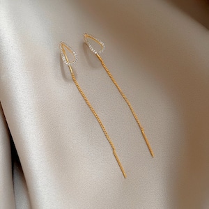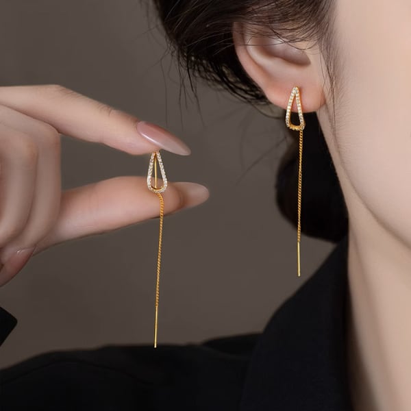 しずくのように輝くラインストーンと、繊細なゴールドチェーンが揺れる、上品なスレッドピアス。横顔に優雅な印象を添える、洗練された大人のアクセサリーです。