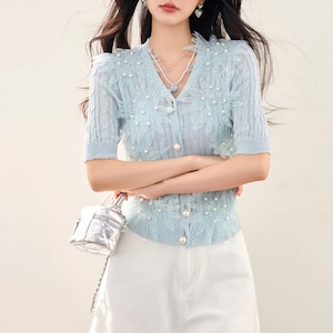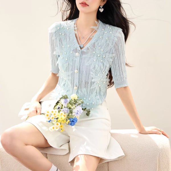 ふんだんにあしらわれた立体モチーフとパール装飾が目を引く一枚。透け感のある編地が涼しげで、季節の装いに軽やかな華やぎを添えます。