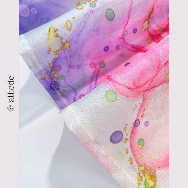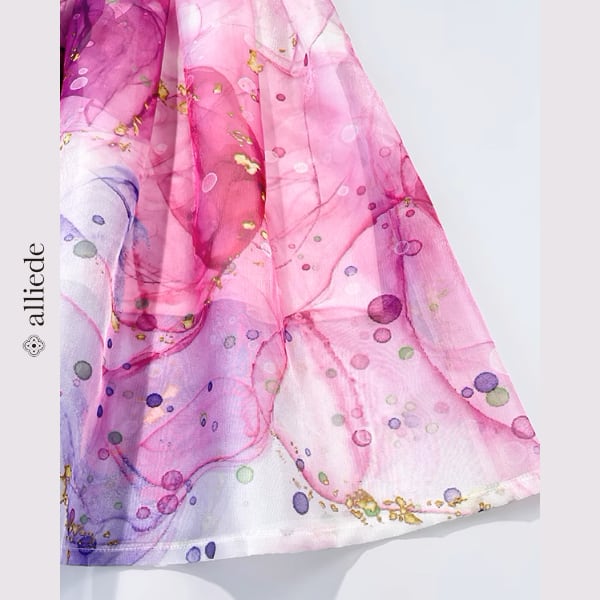水彩画のような幻想的なプリントが目を引くフレアスカート。透け感のある軽やかな素材で、歩くたびにふんわり揺れる華やかさが魅力。