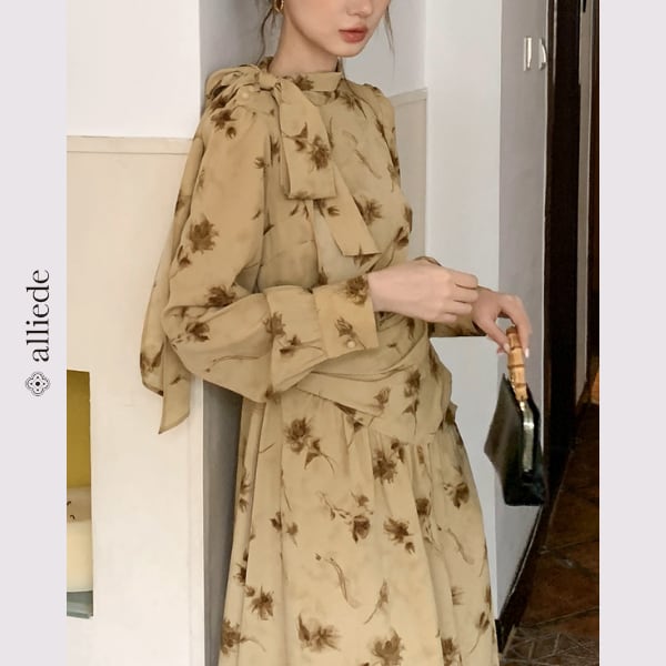 落ち着いたトーンのフラワープリントが大人の雰囲気を引き立てるワンピース。ウエストの切替とタイネックデザインで上品さを演出し、デイリーから特別な日まで幅広く活躍します。