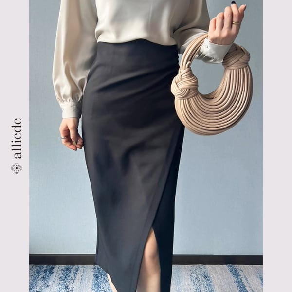 サイドに入ったラップ風スリットが、歩くたびに女性らしい抜け感を演出するペンシルスカート。高めのウエストラインがスタイルを美しく見せ、オフィスから特別なお出かけまで幅広く活躍します。