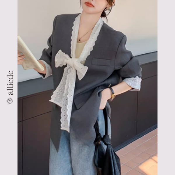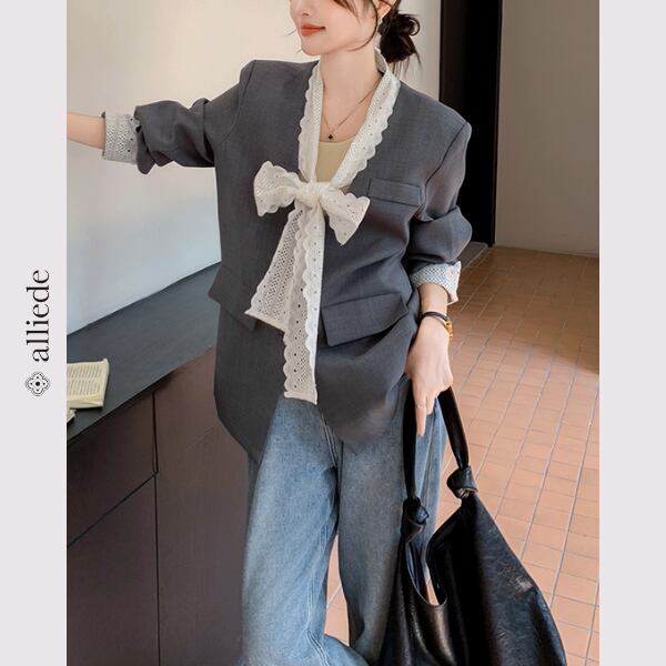 クラシカルなレースの縁取りと大きめリボンがポイントのジャケット。程よくゆとりのあるシルエットで体型をカバーしつつ、フェミニンな印象をプラス。デニムにもスカートにも合わせやすい万能アイテムです。 【サイズ】 S /着丈 71cm /バスト 108cm /肩幅 43cm /袖丈 59.5cm M /着丈 72cm /バスト 112cm /肩幅 44cm /袖丈 60.5cm L /着丈 73cm /バスト 116cm /肩幅 45cm /袖丈 61.5cm XL /着丈 74cm /バスト 120cm /肩幅 46cm /袖丈 62.5cm ※1〜3cmの誤差が生じる場合がございます 【素材】 ポリエステル 【カラー】 グレー 【お届けについて】 当ショップはお客様の商品を1点1点検品・梱包をした後、海外からの直接発送となります。 そのため発送までにご決済から3週間前後のお時間を頂いております。 お時間にゆとりを持ってご購入頂くことをおすすめいたします。 ◼️注意事項 ・タイミングによっては商品在庫切れにより注文キャンセルとさせていただく恐れもございますので、予めご了承くださいませ。 ・こちらは輸入品となります。日本製とは検品基準が異なる為、新品未使用品でもごくわずかな汚れやほつれがある場合もございます。 ・仕入れ工場を変えることがあるため、記載サイズと若干異なる場合がございます。 ・商品の色味は、お手持ちのスマートフォンの画面によって実物と若干異なる場合がございます。 ・イメージ違いやサイズ交換等、お客さまご都合による交換、返品は対応出来かねます。 ———————————— ご購入前にこちらをお読みください →https://www.alliede.shop/about ————————————