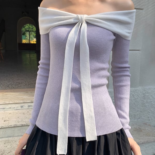 デコルテを美しく見せるオフショルデザインに、リボン風のディテールをプラスしたリブニットトップス。女性らしい華やかさと上品さを兼ね備え、スカートにもパンツにも合わせやすい一枚です。