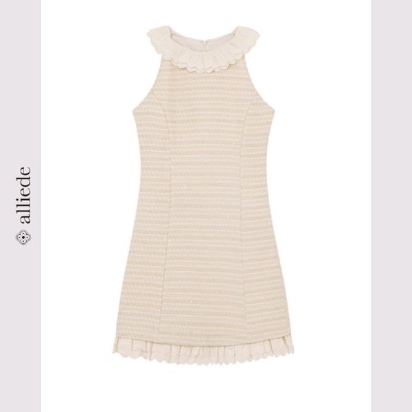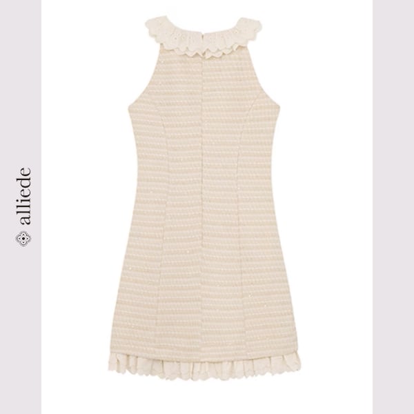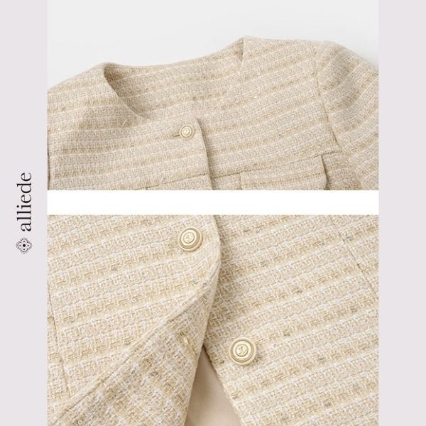上品なフリル襟が目を惹くジャケットとワンピースのセットアップ。立体感のある織り素材が華やかさをプラスし、特別なシーンを女性らしく演出します。
