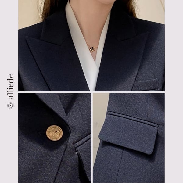 ゴールドボタンが映えるダブルジャケットと美脚見えパンツのセットアップ。きちんと感と女性らしさを両立し、ビジネスから特別なお出かけまで幅広く活躍します。 【サイズ】 ジャケット S /着丈 63cm /バスト 86cm /ウエスト/ 68cm /肩幅 37cm /袖丈 57cm M /着丈 64cm /バスト 90cm /ウエスト/ 72cm /肩幅 38cm /袖丈 57cm L /着丈 65cm /バスト 94cm /ウエスト/ 76cm /肩幅 39cm /袖丈 58cm XL /着丈 66cm /バスト 98cm /ウエスト/ 80cm /肩幅 40cm /袖丈 58cm 2XL /着丈 67cm /バスト 102cm /ウエスト/ 84cm /肩幅 41cm /袖丈 59cm 3XL /着丈 67cm /バスト 106cm /ウエスト/ 88cm /肩幅 42cm /袖丈 59cm パンツ S /着丈 100cm /ウエスト 68cm /ヒップ 90cm /脚口 53cm M /着丈 101cm /ウエスト 72cm /ヒップ 94cm /脚口 54.6cm L /着丈 102cm /ウエスト 76cm /ヒップ 98cm /脚口 56.2cm XL /着丈 103cm /ウエスト 80cm /ヒップ 102cm /脚口 57.4cm 2XL /着丈 104cm /ウエスト 84cm /ヒップ 106cm /脚口 58.6cm 3XL /着丈 105cm /ウエスト 88cm /ヒップ 110cm /脚口 59.8cm ※1〜3cmの誤差が生じる場合がございます 【素材】 ポリエステル・スパンデックス 【カラー】 ネイビーブルー 【お届けについて】 当ショップはお客様の商品を1点1点検品・梱包をした後、海外からの直接発送となります。 そのため発送までにご決済から3週間前後のお時間を頂いております。 お時間にゆとりを持ってご購入頂くことをおすすめいたします。 ◼️注意事項 ・タイミングによっては商品在庫切れにより注文キャンセルとさせていただく恐れもございますので、予めご了承くださいませ。 ・こちらは輸入品となります。日本製とは検品基準が異なる為、新品未使用品でもごくわずかな汚れやほつれがある場合もございます。 ・仕入れ工場を変えることがあるため、記載サイズと若干異なる場合がございます。 ・商品の色味は、お手持ちのスマートフォンの画面によって実物と若干異なる場合がございます。 ・イメージ違いやサイズ交換等、お客さまご都合による交換、返品は対応出来かねます。 ———————————— ご購入前にこちらをお読みください →https://www.alliede.shop/about ————————————