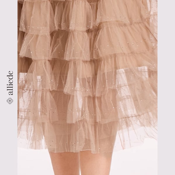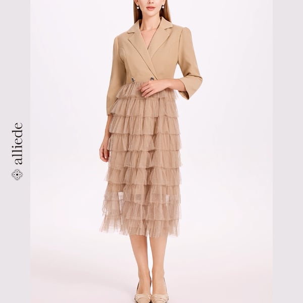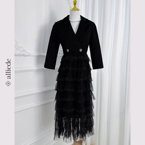 ジャケット風デザインに、ふんわり広がるチュールのティアードスカートを組み合わせた一枚。上品さと華やかさを兼ね備え、シーンを選ばず着映えるワンピースです。 【サイズ】 S /着丈 115cm /バスト 88cm /ウエスト 70cm /肩幅 35cm /袖丈 44cm M /着丈 116cm /バスト 90cm /ウエスト 72cm /肩幅 36cm /袖丈 45cm L /着丈 117cm /バスト 94cm /ウエスト 76cm /肩幅 37cm /袖丈 46cm XL /着丈 118cm /バスト 98cm /ウエスト 80cm /肩幅 38cm /袖丈 47cm 2XL /着丈 119cm /バスト 102cm /ウエスト 84cm /肩幅 39cm /袖丈 48cm ※1〜3cmの誤差が生じる場合がございます 【素材】 ポリエステル ベージュ・ブラック 【お届けについて】 当ショップはお客様の商品を1点1点検品・梱包をした後、海外からの直接発送となります。 そのため発送までにご決済から3週間前後のお時間を頂いております。 お時間にゆとりを持ってご購入頂くことをおすすめいたします。 ◼️注意事項 ・タイミングによっては商品在庫切れにより注文キャンセルとさせていただく恐れもございますので、予めご了承くださいませ。 ・こちらは輸入品となります。日本製とは検品基準が異なる為、新品未使用品でもごくわずかな汚れやほつれがある場合もございます。 ・仕入れ工場を変えることがあるため、記載サイズと若干異なる場合がございます。 ・商品の色味は、お手持ちのスマートフォンの画面によって実物と若干異なる場合がございます。 ・イメージ違いやサイズ交換等、お客さまご都合による交換、返品は対応出来かねます。 ———————————— ご購入前にこちらをお読みください →https://www.alliede.shop/about ————————————