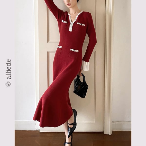 クラシカルな深みのあるカラーに、襟元とポケットを彩るフリンジトリムが映えるニットワンピース。程よく身体に沿うシルエットが女性らしさを引き立て、1枚で華やかな印象に仕上がります。