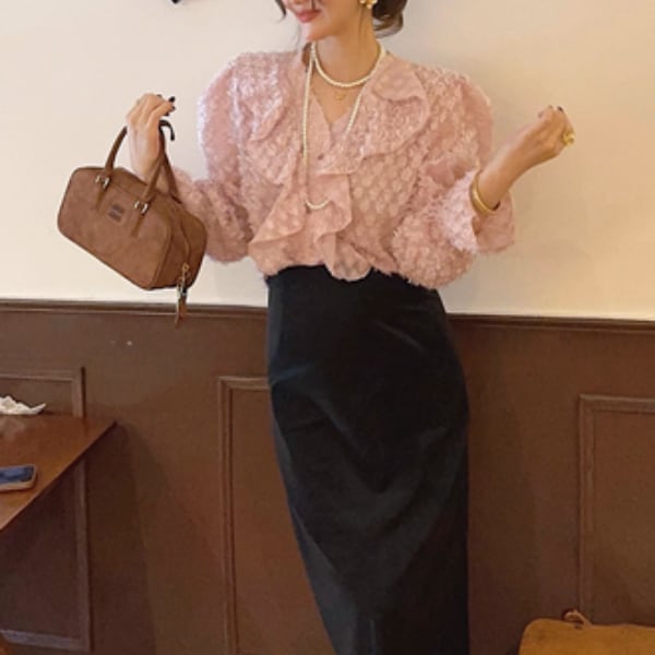 立体感のあるテクスチャー素材にフリルをあしらったVネックブラウス。甘さのある華やかなデザインで、デイリーにもお出かけにも活躍。ボトムを選ばず、着こなしを引き立てます。