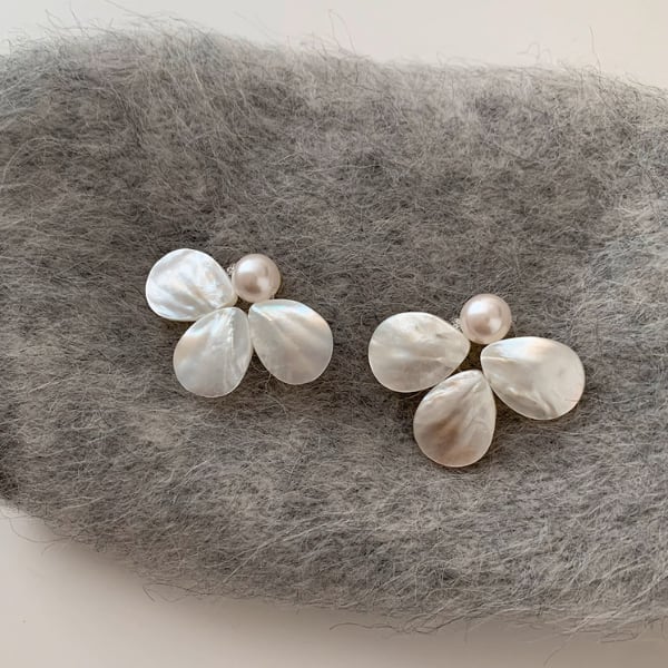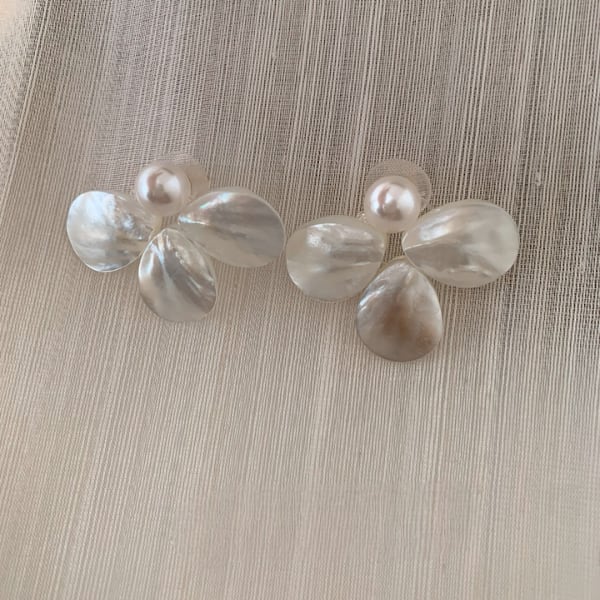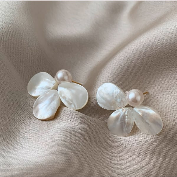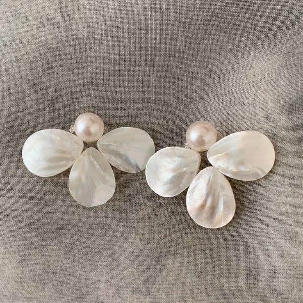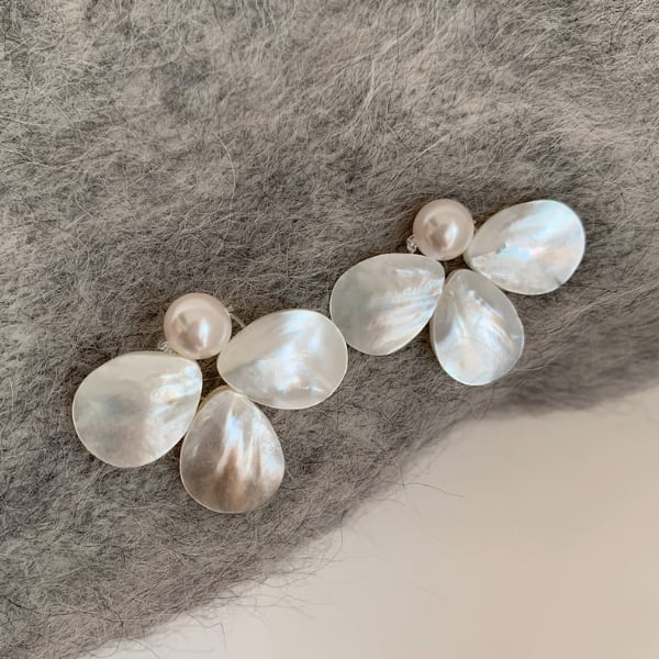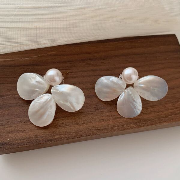 光を受けて輝くシェルと上品なパールを組み合わせたフラワーモチーフピアス。華やかさと清楚さを兼ね備え、顔まわりを明るく見せてくれます。