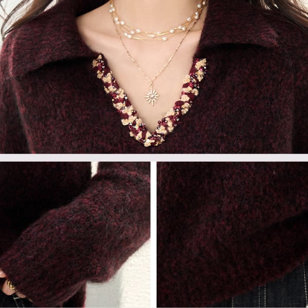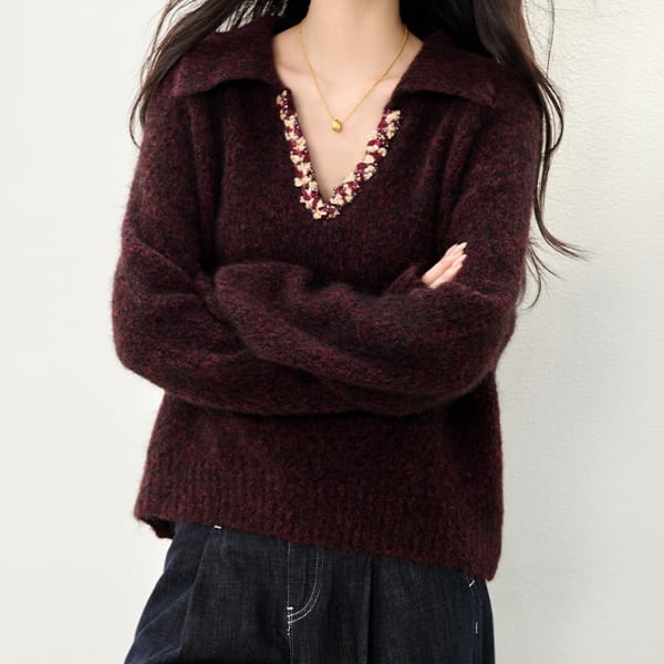 襟付き深めのVネックに繊細なディテールをあしらったニット。ふんわりとした質感と深みのあるカラーが魅力。シンプルながら存在感のある一枚。 【サイズ】 S /着丈 55cm /バスト 100cm /肩幅 37cm /袖丈 63.7cm M /着丈 56.5cm /バスト 104cm /肩幅 38cm /袖丈 65cm L /着丈 58cm /バスト 108cm /肩幅 39cm /袖丈 66.3cm ※1〜3cmの誤差が生じる場合がございます 【素材】 ポリエステル 【カラー】 パープルレッド 【お届けについて】 当ショップはお客様の商品を1点1点検品・梱包をした後、海外からの直接発送となります。 そのため発送までにご決済から3週間前後のお時間を頂いております。 お時間にゆとりを持ってご購入頂くことをおすすめいたします。 ◼️注意事項 ・タイミングによっては商品在庫切れにより注文キャンセルとさせていただく恐れもございますので、予めご了承くださいませ。 ・こちらは輸入品となります。日本製とは検品基準が異なる為、新品未使用品でもごくわずかな汚れやほつれがある場合もございます。 ・仕入れ工場を変えることがあるため、記載サイズと若干異なる場合がございます。 ・商品の色味は、お手持ちのスマートフォンの画面によって実物と若干異なる場合がございます。 ・イメージ違いやサイズ交換等、お客さまご都合による交換、返品は対応出来かねます。 ———————————— ご購入前にこちらをお読みください →https://www.alliede.shop/about ————————————
