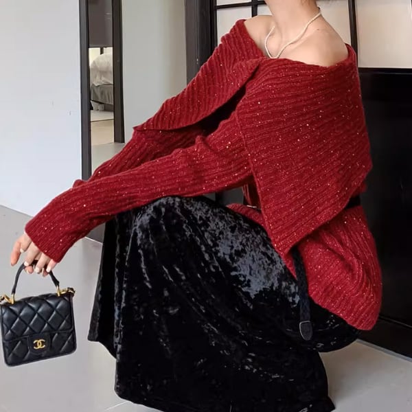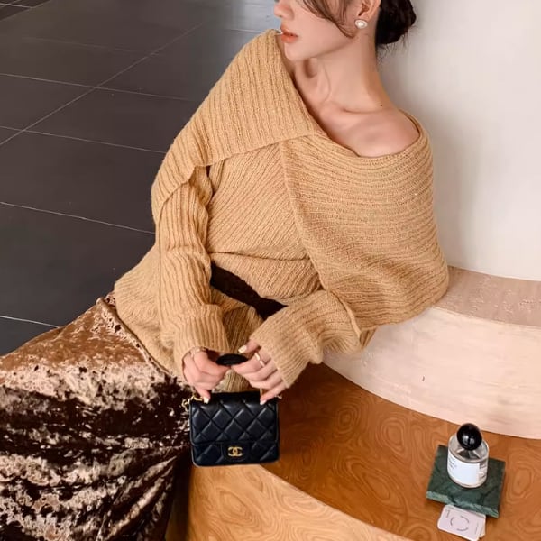 肩を美しく見せるオフショルデザインが魅力のリブニット。