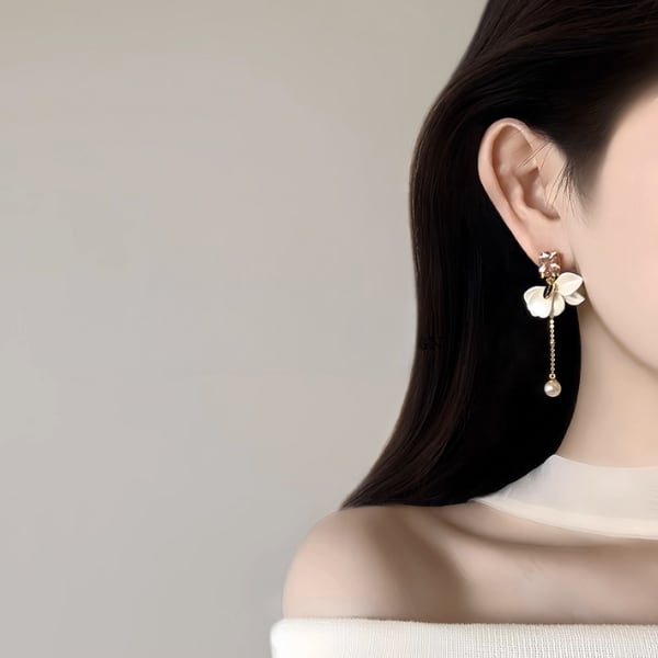 艶めくストーンと花びらモチーフが揺れるアシンメトリーデザイン。繊細なパールチェーンが耳元を華やかに飾り、顔まわりに上品な輝きを添えます。