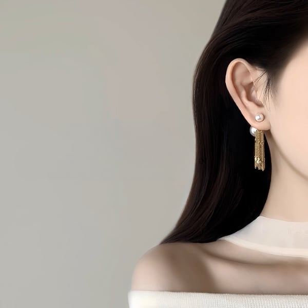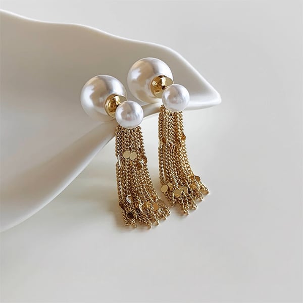 大粒パールに揺れるゴールドチェーンが華やかに輝くタッセルピアス。動くたびに光を集め、上品さと存在感を両立。特別な日にもデイリーにも映えるデザイン。
