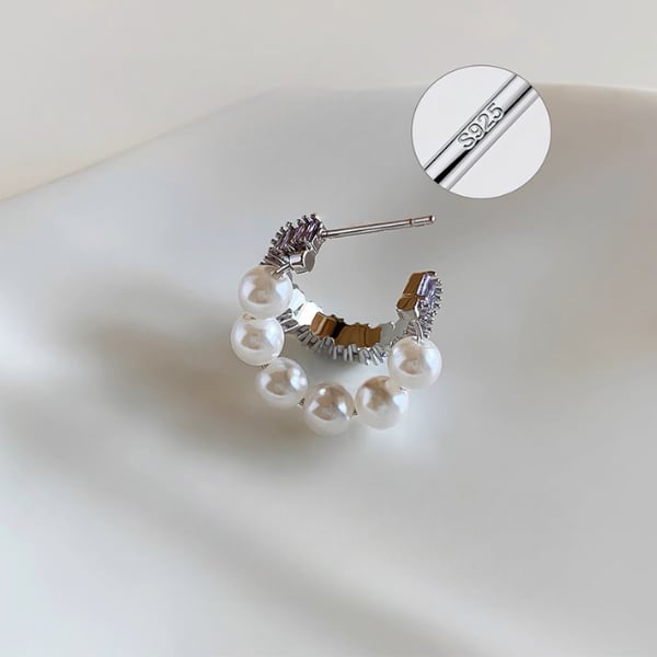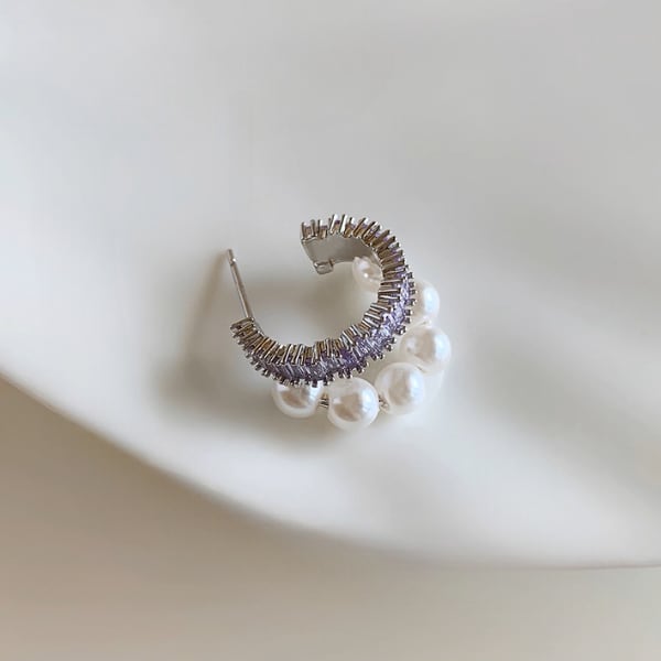 パールとクリアストーンが連なったフープピアス。繊細な輝きが耳元を彩り、上品さと華やかさを兼ね備えたデザイン。デイリーにも特別な日にも◎。