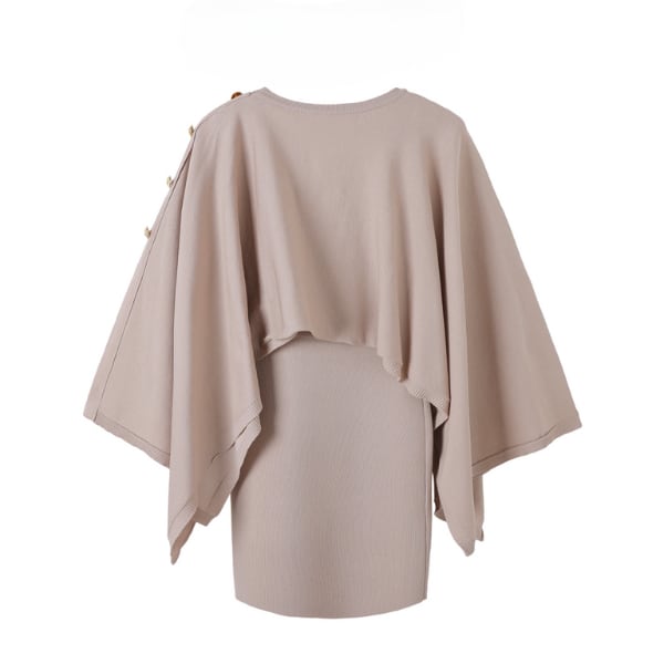 肩に並ぶゴールドボタンがさりげないアクセント。ケープのように広がるスリーブが美しいシルエットを描くロングニット。一枚で印象的なスタイルに。