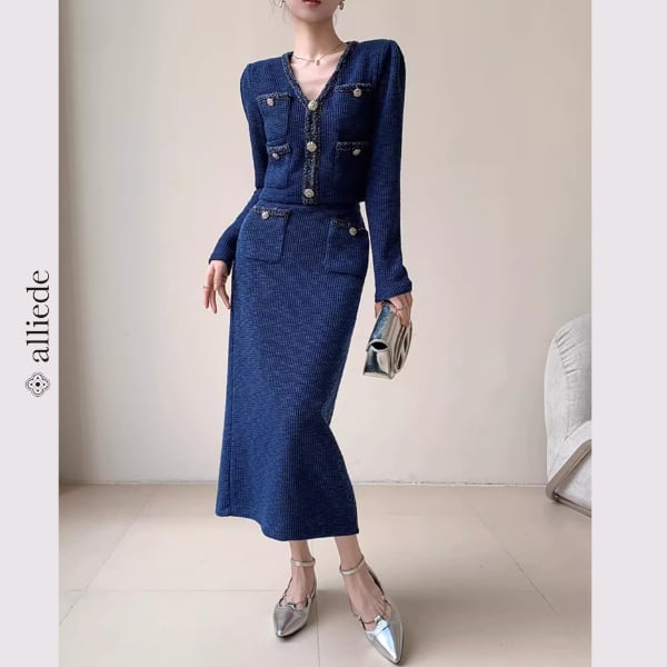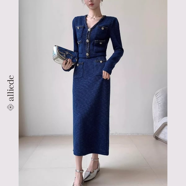 立体感のある編地と装飾ボタンがアクセントになり、シンプルながらも華やかさを演出。