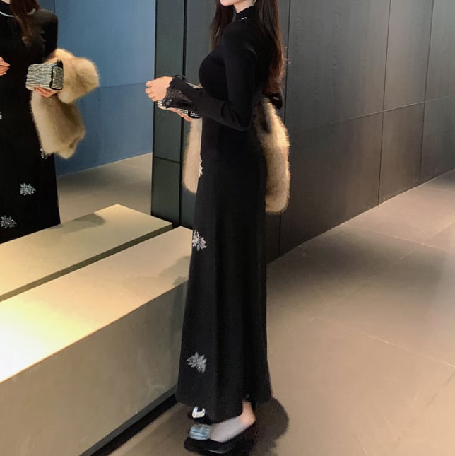 上品なビジューフラワーが視線を惹きつけるロングスカート。ほどよいフィット感と美しい落ち感で、歩くたびにシルエットが映える一着。
