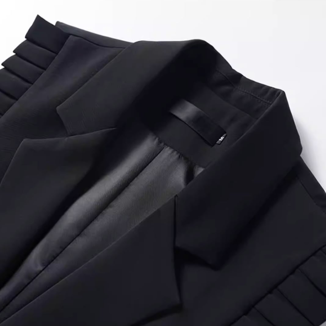 襟まわりにプリーツデザインを施したテーラードジレ。縦のラインを意識したシルエットで、すっきりとした印象に整います。