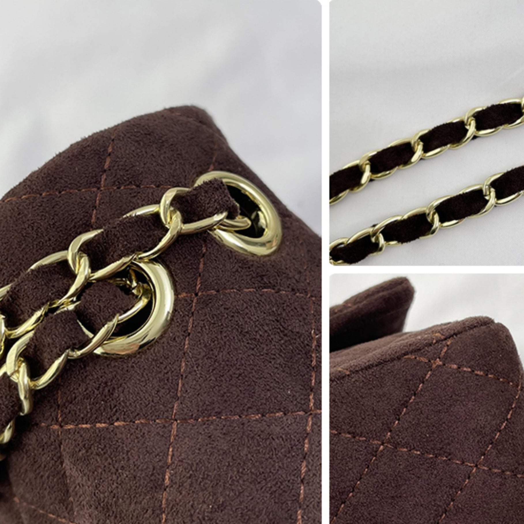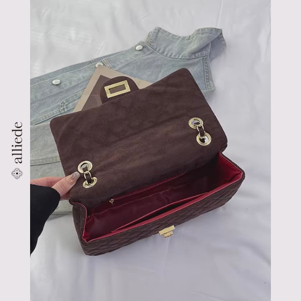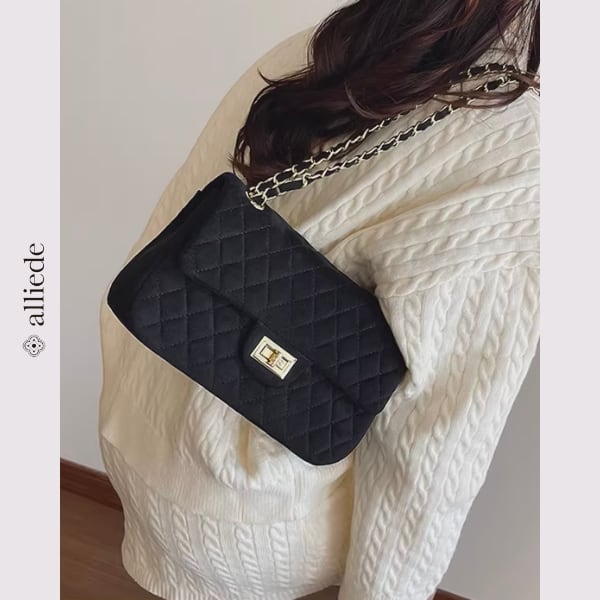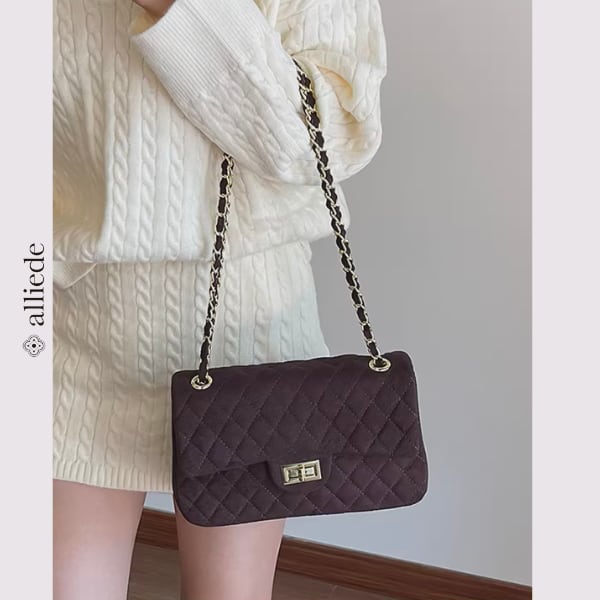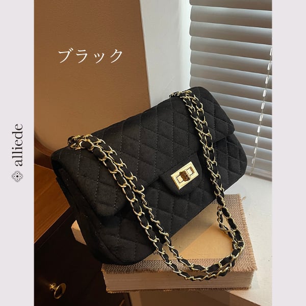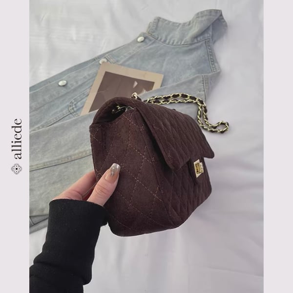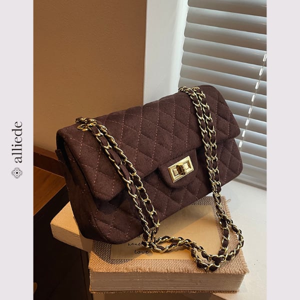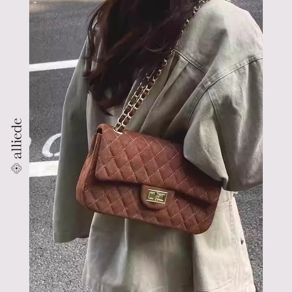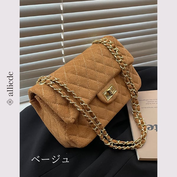 スエード調のキルティングに、ゴールドチェーンが映えるショルダーバッグ。程よいサイズ感で必需品がすっきり収まり、デイリーからお出かけまで幅広いシーンで活躍する一品です。