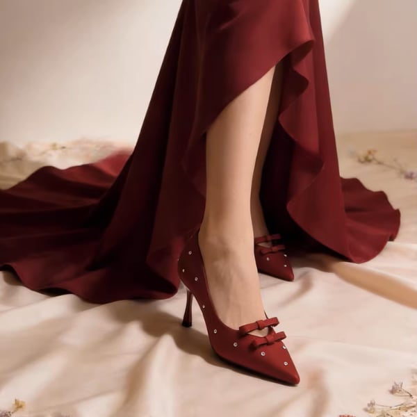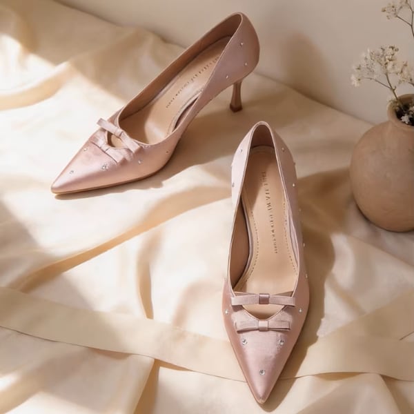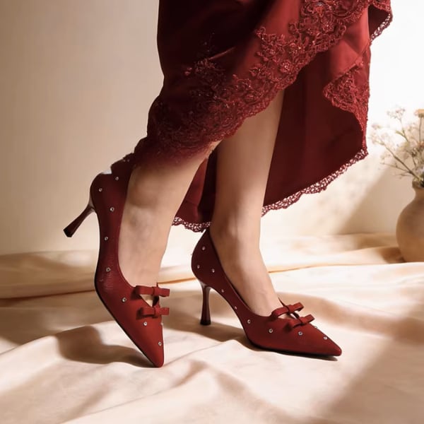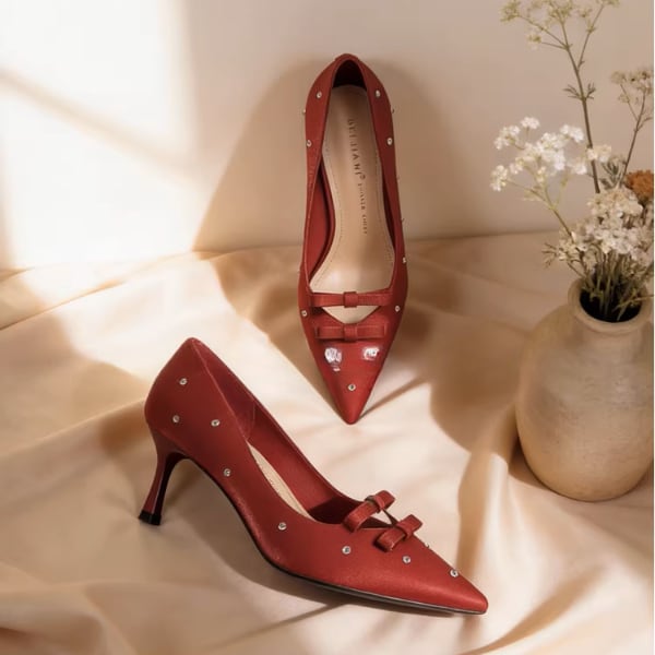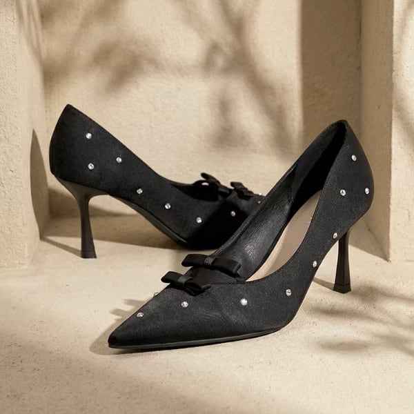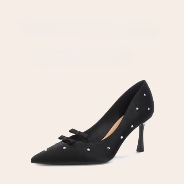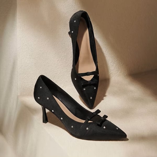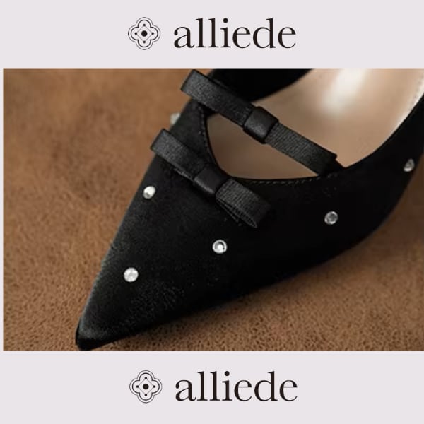 華奢なリボンときらめくビジューが足元に上品なアクセントを添えるポインテッドトゥパンプス。約7.5cmヒールで美しい脚長シルエットを演出し、きれいめからお呼ばれシーンまで幅広く活躍します。