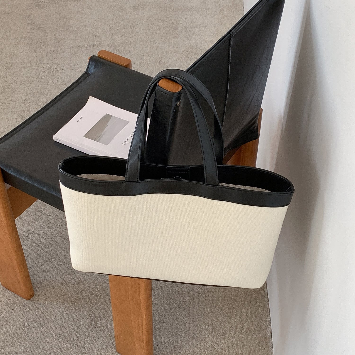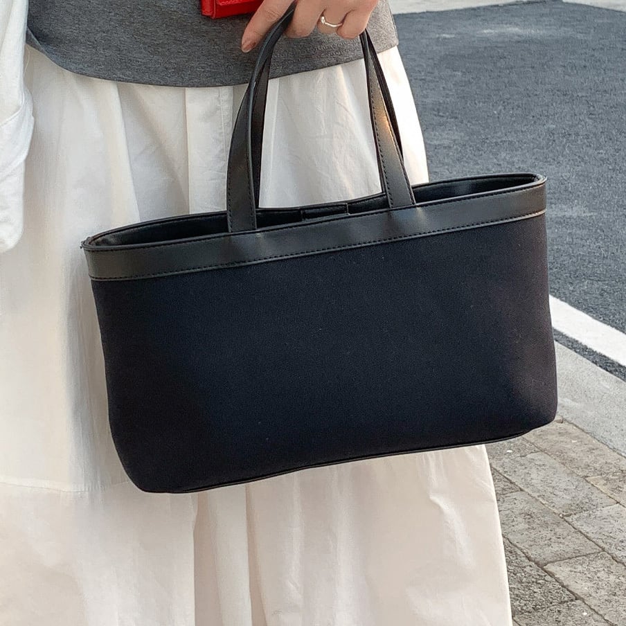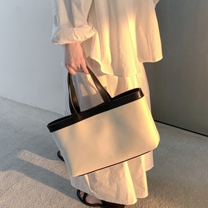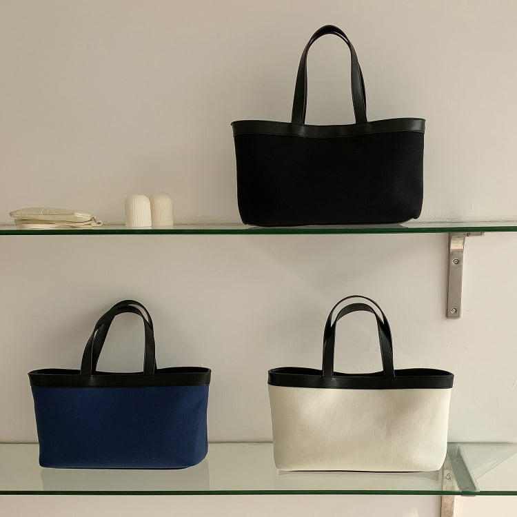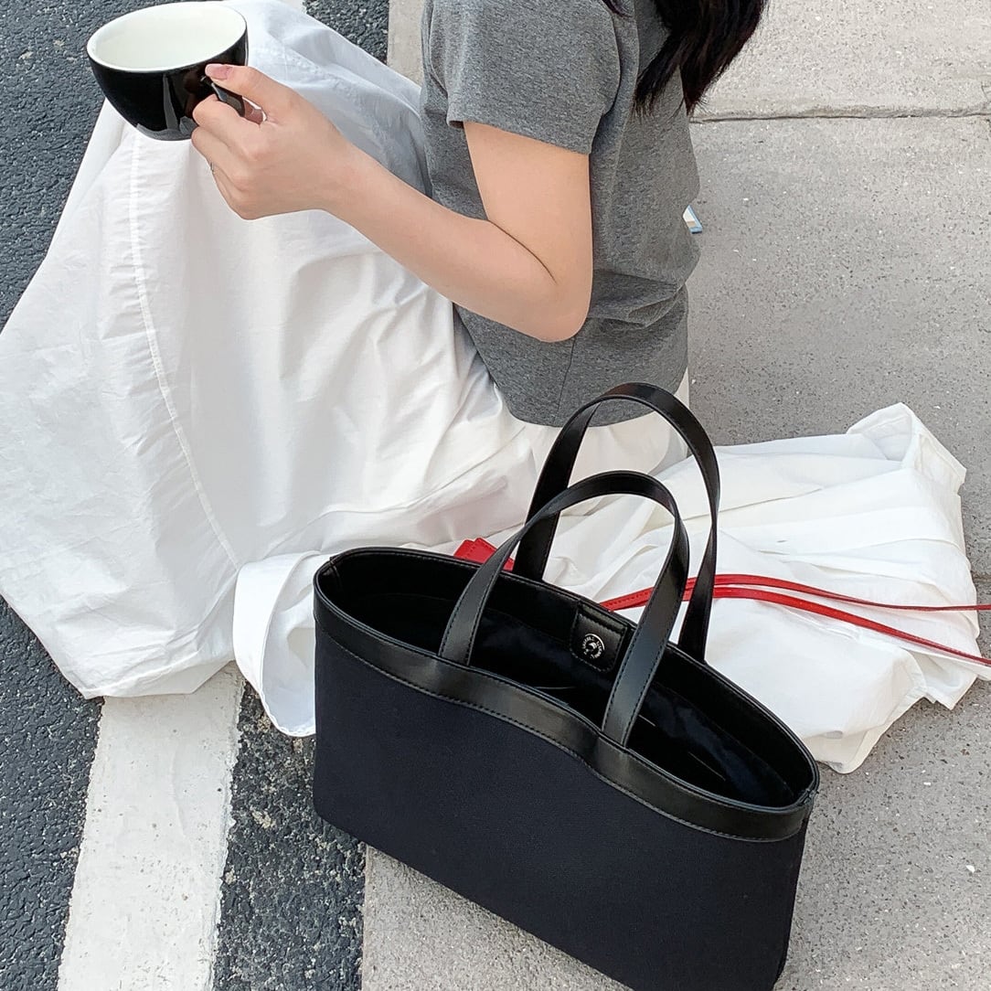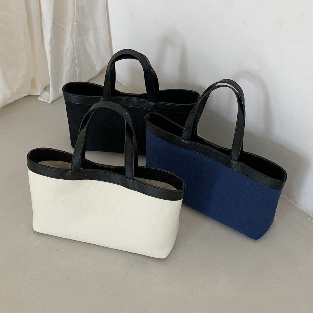 ナチュラルなキャンバス地に配色デザインが映えるトートバッグ。マグネット開閉で使いやすく、マチ付きで収納力も◎。 【サイズ】 高さ 20.5cm /持ち手を含む高さ 39cm /横幅 34cm /マチ8cm ※1〜3cmの誤差が生じる場合がございます 【素材】 PU・帆布 【カラー】 ホワイト・ブラック・ネイビー 【お届けについて】 当ショップはお客様の商品を1点1点検品・梱包をした後、海外からの直接発送となります。 そのため発送までにご決済から3週間前後のお時間を頂いております。 お時間にゆとりを持ってご購入頂くことをおすすめいたします。 ◼️注意事項 ・タイミングによっては商品在庫切れにより注文キャンセルとさせていただく恐れもございますので、予めご了承くださいませ。 ・こちらは輸入品となります。日本製とは検品基準が異なる為、新品未使用品でもごくわずかな汚れやほつれがある場合もございます。 ・仕入れ工場を変えることがあるため、記載サイズと若干異なる場合がございます。 ・商品の色味は、お手持ちのスマートフォンの画面によって実物と若干異なる場合がございます。 ・イメージ違いやサイズ交換等、お客さまご都合による交換、返品は対応出来かねます。 ———————————— ご購入前にこちらをお読みください →https://www.alliede.shop/about ————————————