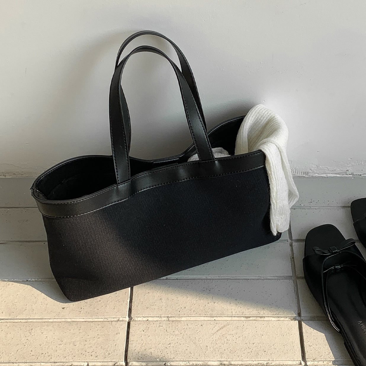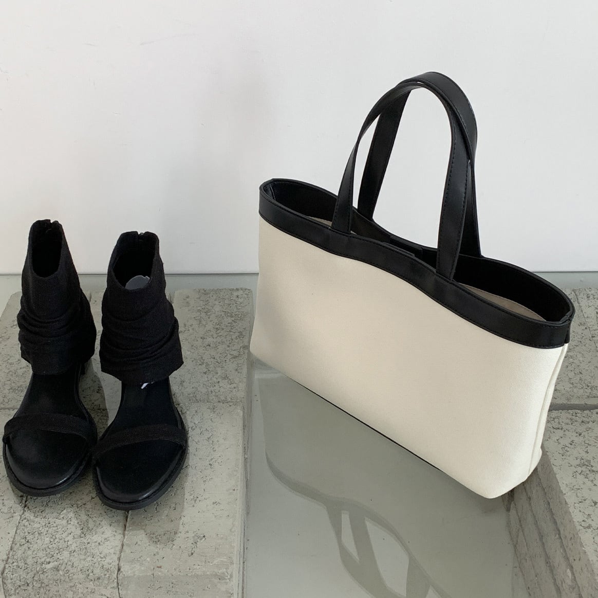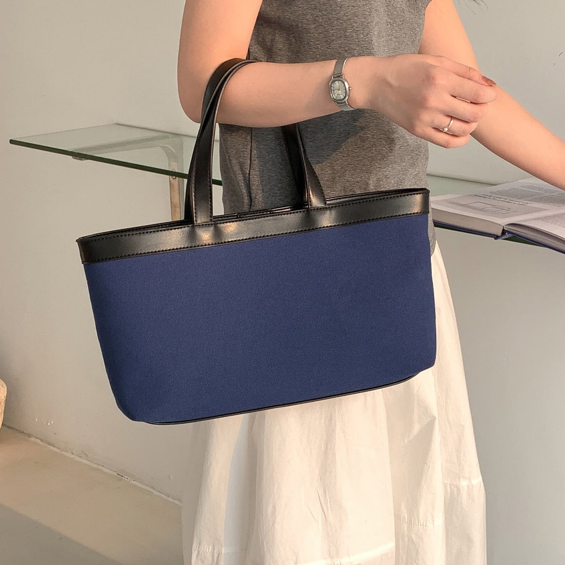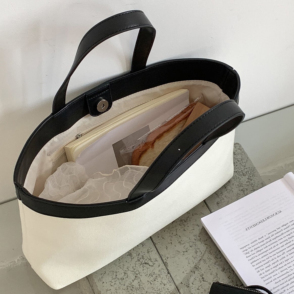 ナチュラルなキャンバス地に配色デザインが映えるトートバッグ。マグネット開閉で使いやすく、マチ付きで収納力も◎。 【サイズ】 高さ 20.5cm /持ち手を含む高さ 39cm /横幅 34cm /マチ8cm ※1〜3cmの誤差が生じる場合がございます 【素材】 PU・帆布 【カラー】 ホワイト・ブラック・ネイビー 【お届けについて】 当ショップはお客様の商品を1点1点検品・梱包をした後、海外からの直接発送となります。 そのため発送までにご決済から3週間前後のお時間を頂いております。 お時間にゆとりを持ってご購入頂くことをおすすめいたします。 ◼️注意事項 ・タイミングによっては商品在庫切れにより注文キャンセルとさせていただく恐れもございますので、予めご了承くださいませ。 ・こちらは輸入品となります。日本製とは検品基準が異なる為、新品未使用品でもごくわずかな汚れやほつれがある場合もございます。 ・仕入れ工場を変えることがあるため、記載サイズと若干異なる場合がございます。 ・商品の色味は、お手持ちのスマートフォンの画面によって実物と若干異なる場合がございます。 ・イメージ違いやサイズ交換等、お客さまご都合による交換、返品は対応出来かねます。 ———————————— ご購入前にこちらをお読みください →https://www.alliede.shop/about ————————————
