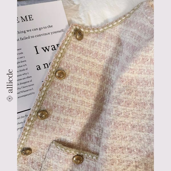 表情のあるツイード素材と縁取りデザインが目を引くノーカラージャケット。フロントのデザインボタンがほどよいアクセントに。