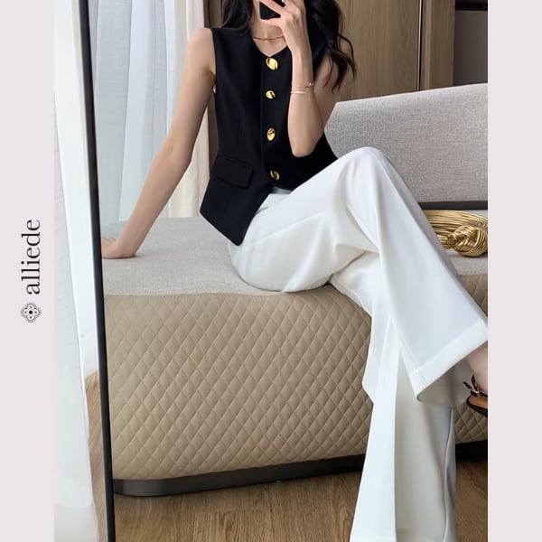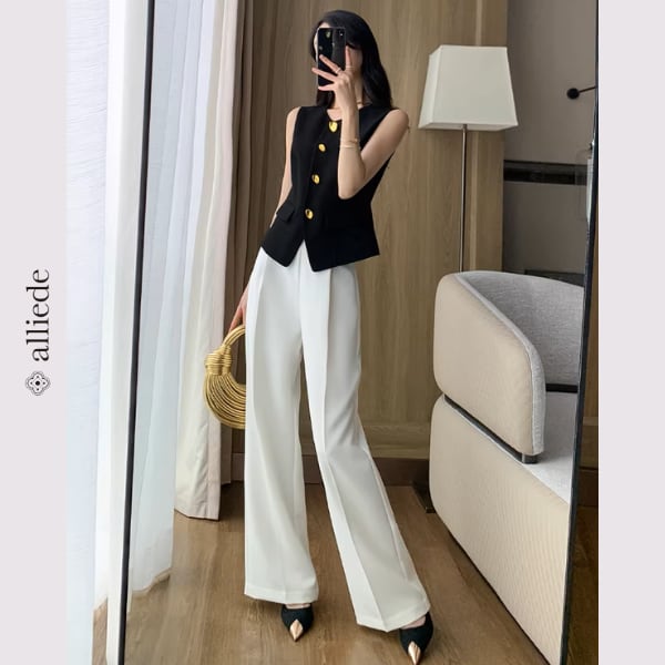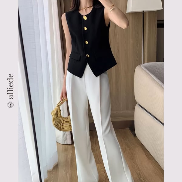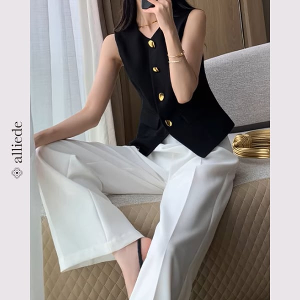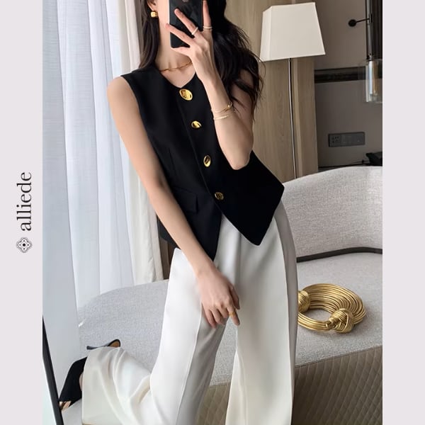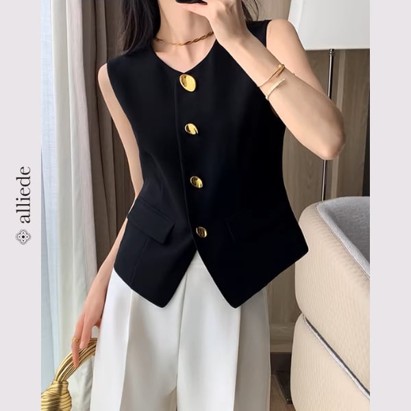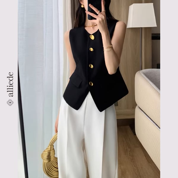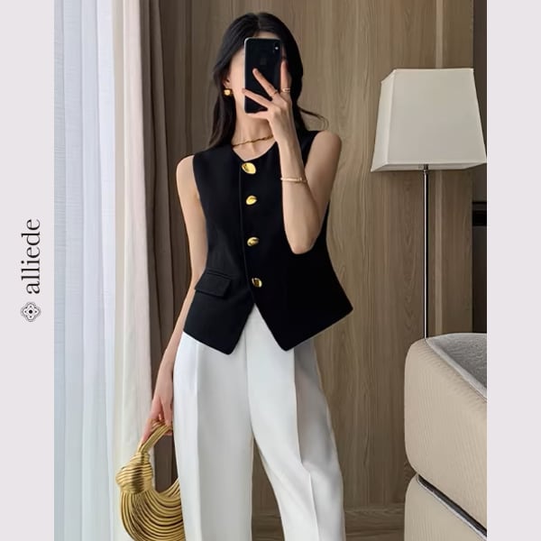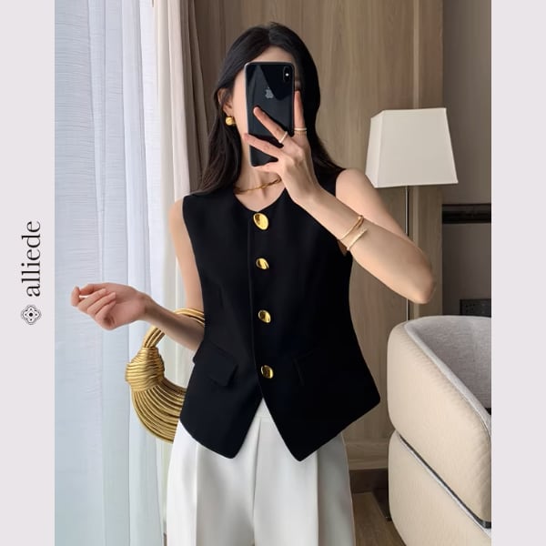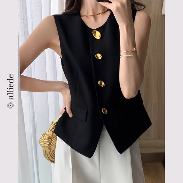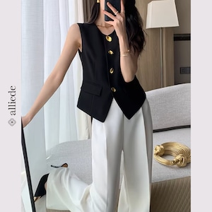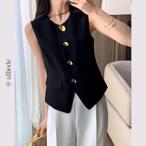 上品なゴールドボタンが目を惹くノーカラージレ。すっきりとしたシルエットと程よくシェイプされたデザインが、きれいめで洗練された印象に。 【サイズ】 S /着丈 52cm /バスト 88cm /肩幅 34cm M /着丈 53cm /バスト 92cm /肩幅 35cm L /着丈 54cm /バスト 96cm /肩幅 36cm ※1〜3cmの誤差が生じる場合がございます 【素材】 ポリエステル・レーヨン・ポリウレタン 【カラー】 ブラック 【お届けについて】 当ショップはお客様の商品を1点1点検品・梱包をした後、海外からの直接発送となります。 そのため発送までにご決済から3週間前後のお時間を頂いております。 お時間にゆとりを持ってご購入頂くことをおすすめいたします。 ◼️注意事項 ・タイミングによっては商品在庫切れにより注文キャンセルとさせていただく恐れもございますので、予めご了承くださいませ。 ・こちらは輸入品となります。日本製とは検品基準が異なる為、新品未使用品でもごくわずかな汚れやほつれがある場合もございます。 ・仕入れ工場を変えることがあるため、記載サイズと若干異なる場合がございます。 ・商品の色味は、お手持ちのスマートフォンの画面によって実物と若干異なる場合がございます。 ・イメージ違いやサイズ交換等、お客さまご都合による交換、返品は対応出来かねます。 ———————————— ご購入前にこちらをお読みください →https://www.alliede.shop/about ————————————