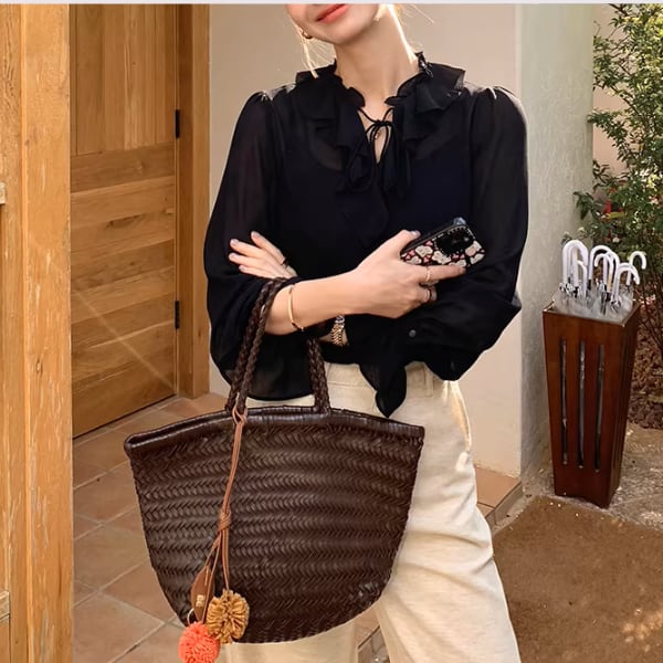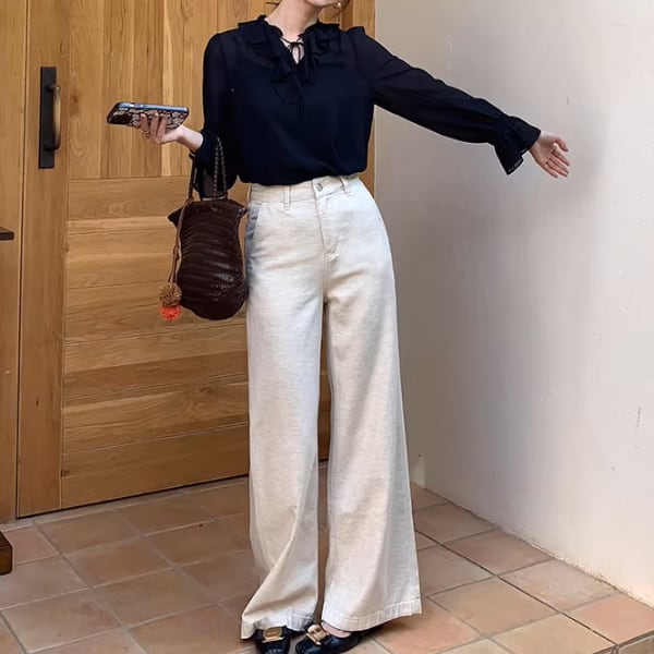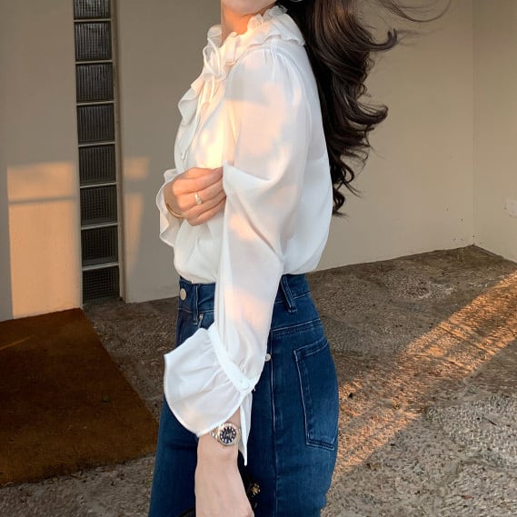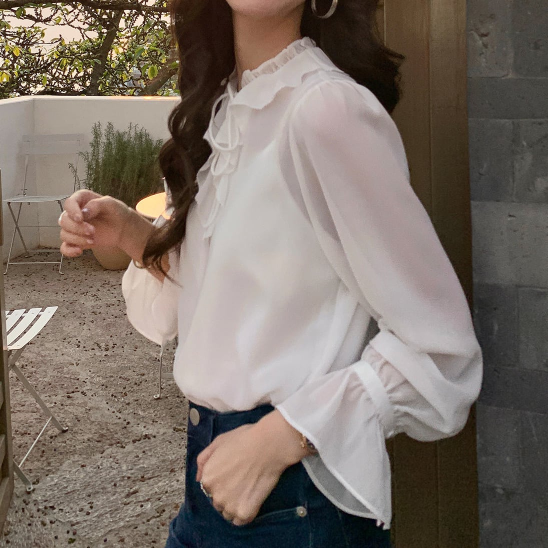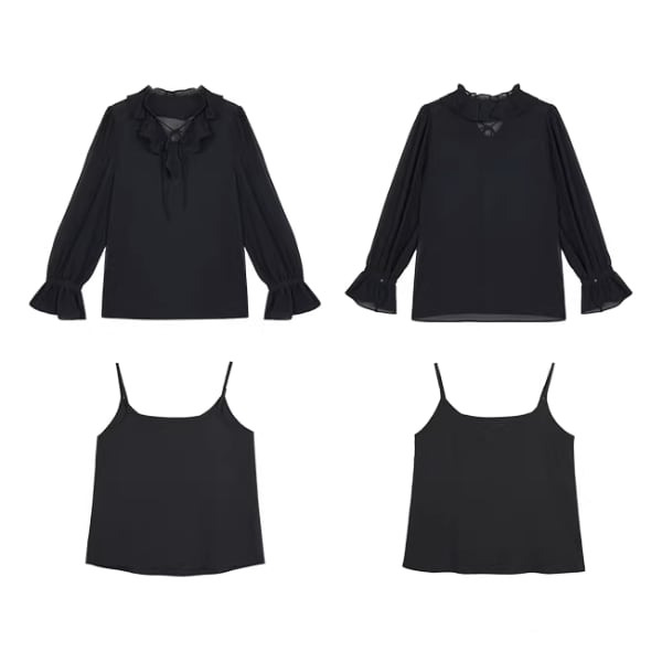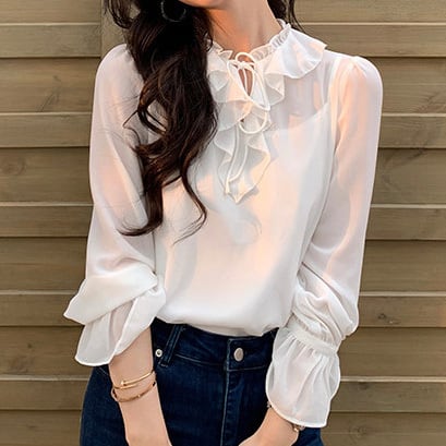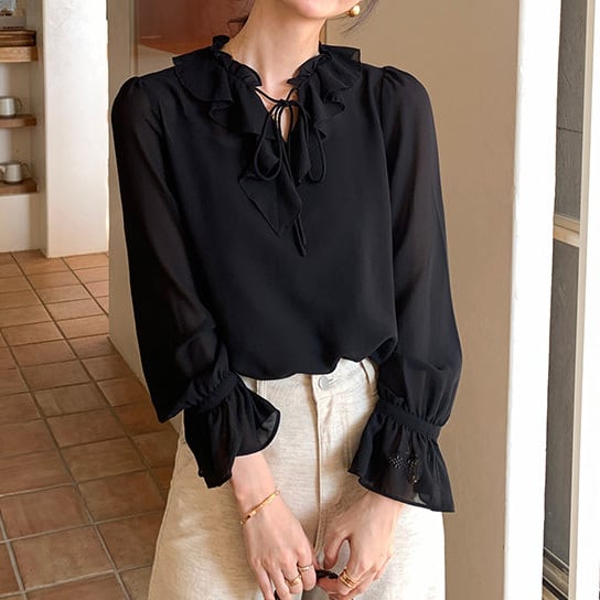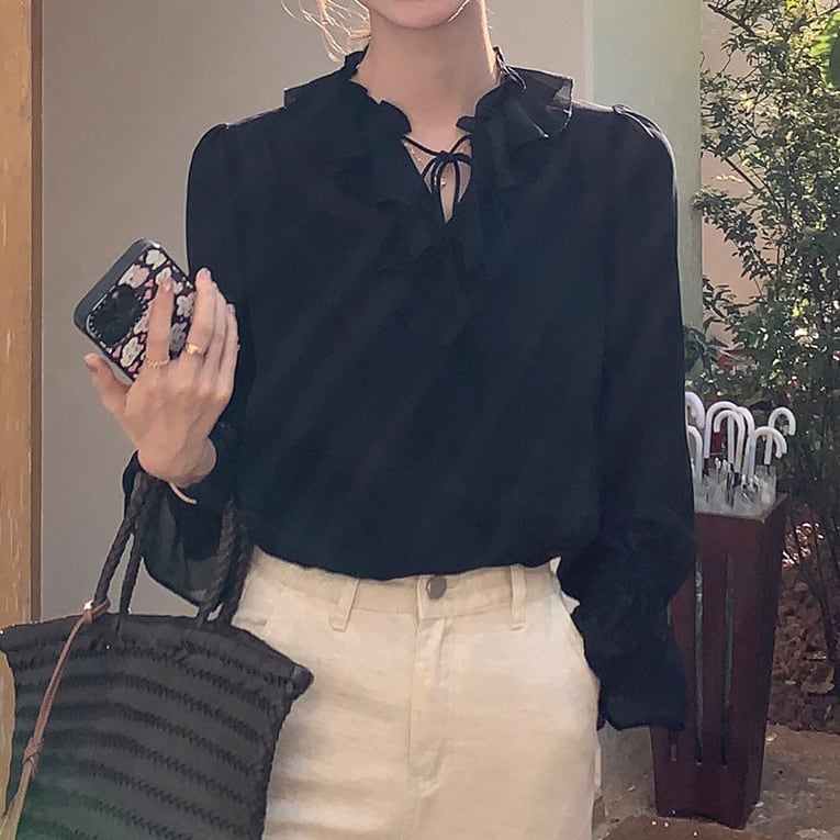 フリルネックとリボンディテールが顔まわりを華やかに演出するシアーブラウス。軽やかな透け感が女性らしさを引き立て、抜け感のある着こなしに。インナーキャミ付きで安心して着用でき、デイリーからお出かけまで幅広く活躍する一着です。