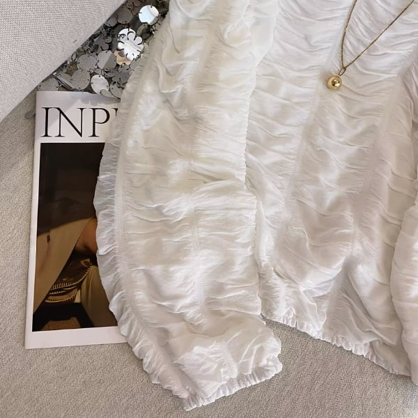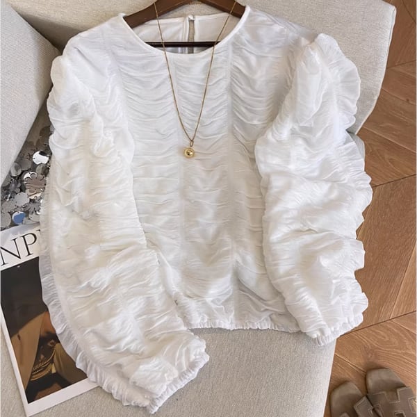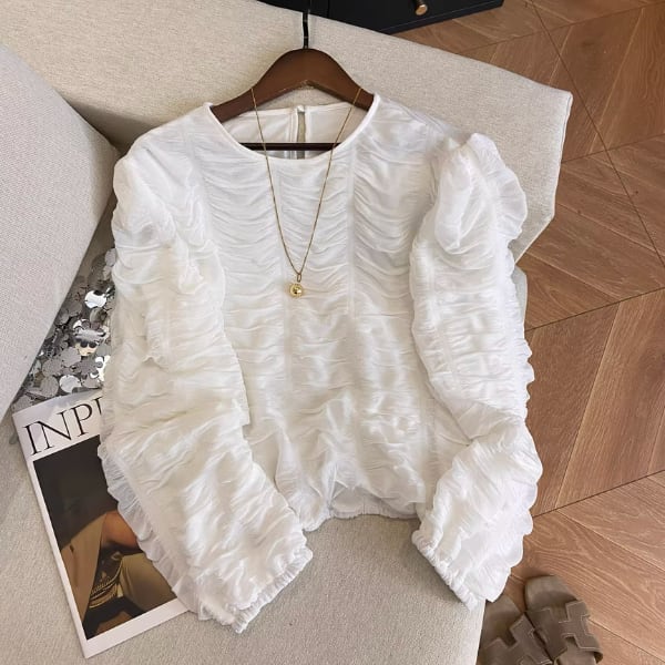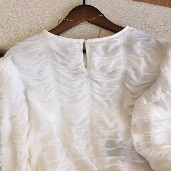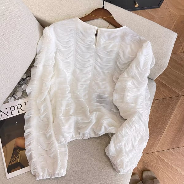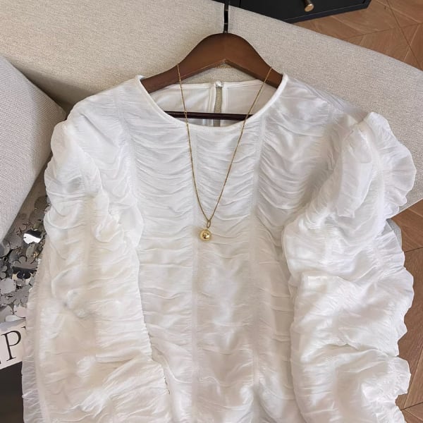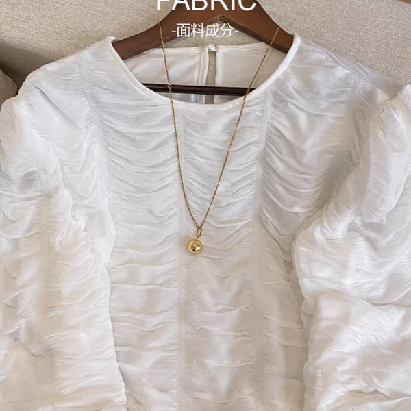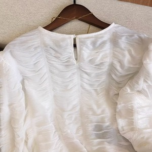 繊細なシャーリングデザインが印象的なブラウス。表情のある素材がさりげなく華やかさを添え、シンプルながら洗練された印象に。コンパクトなシルエットでバランスよく着こなせ、幅広いスタイリングに活躍する一枚です。