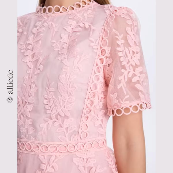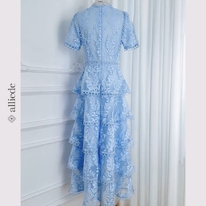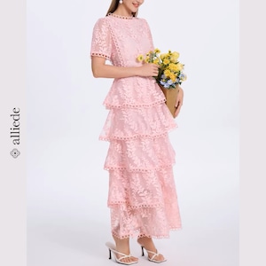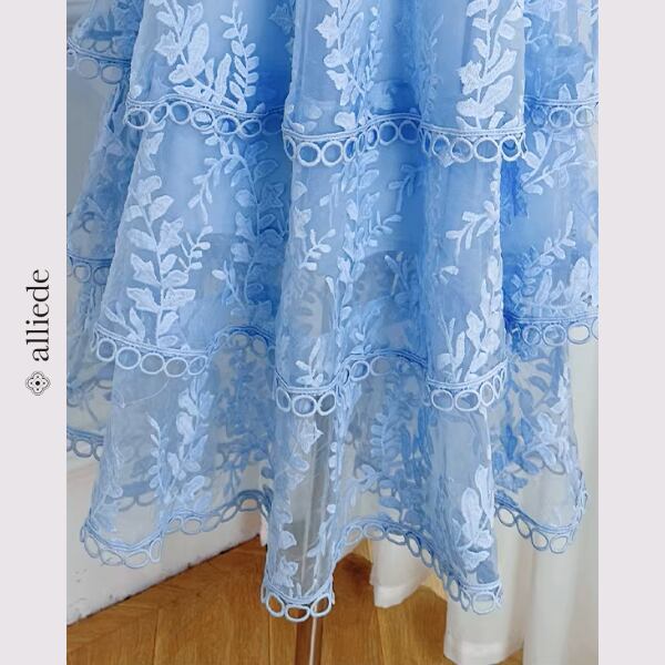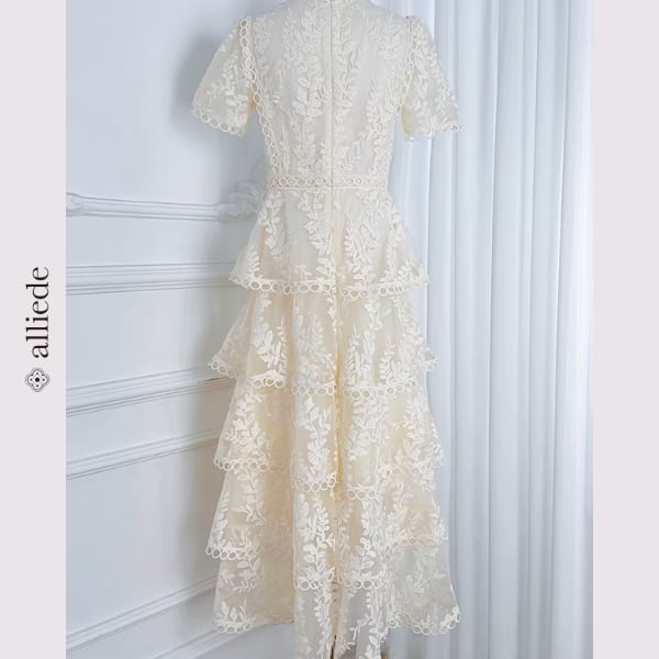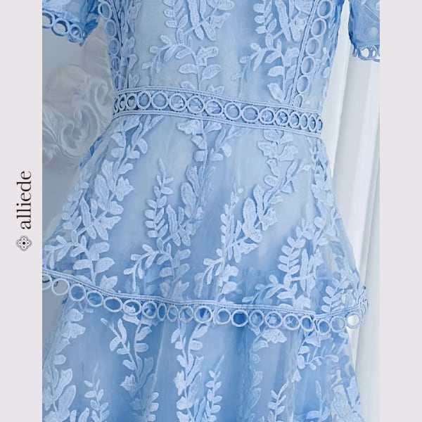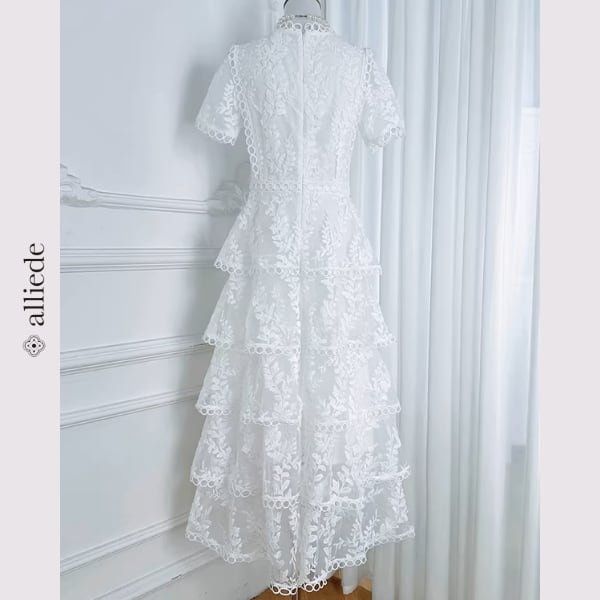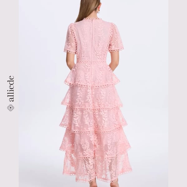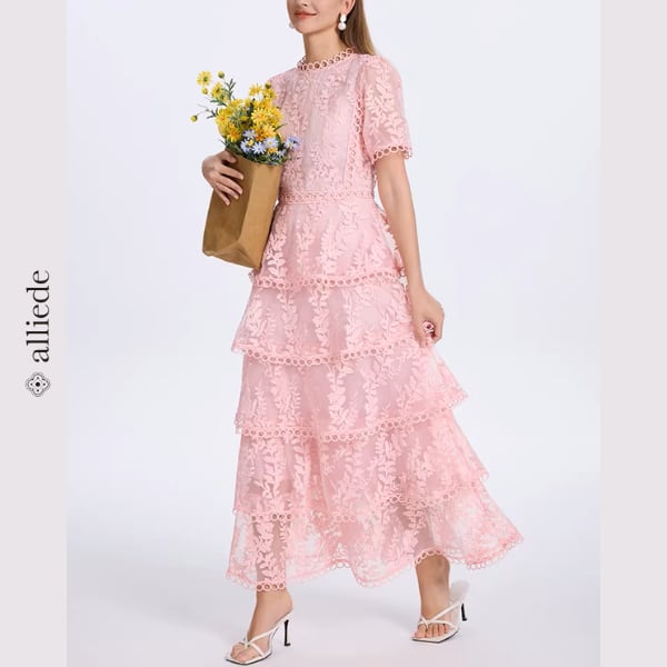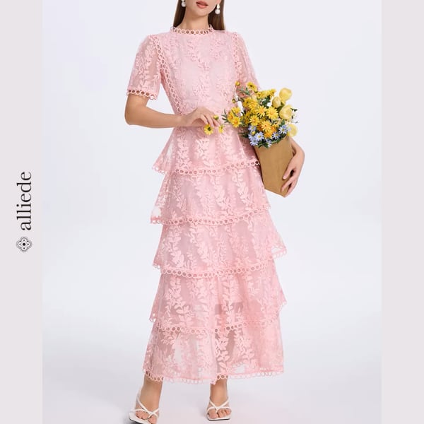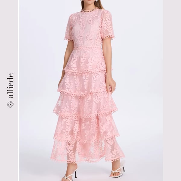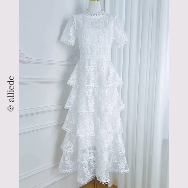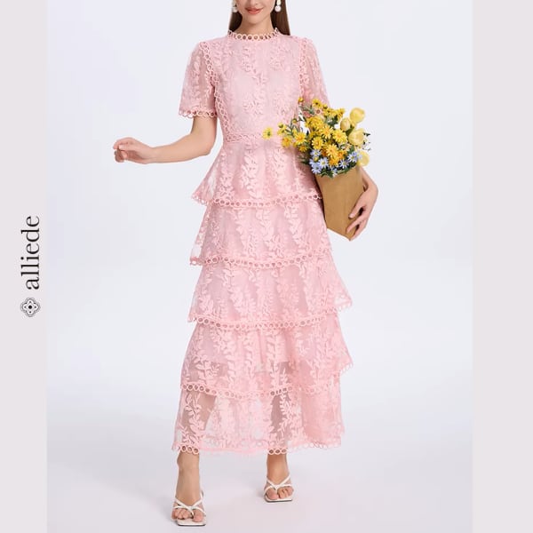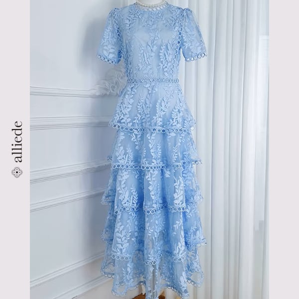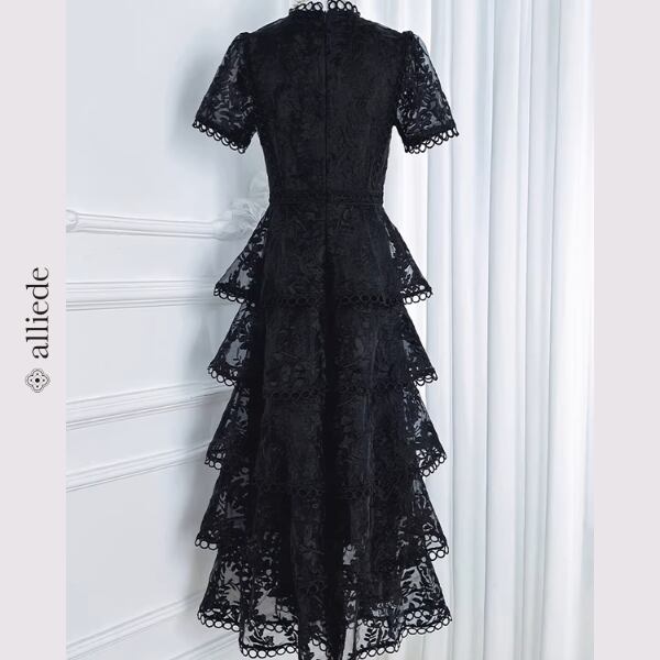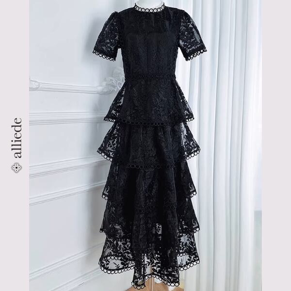 繊細なフラワーレースと段差のあるティアードデザインが華やかさを引き立てる上品ワンピース。