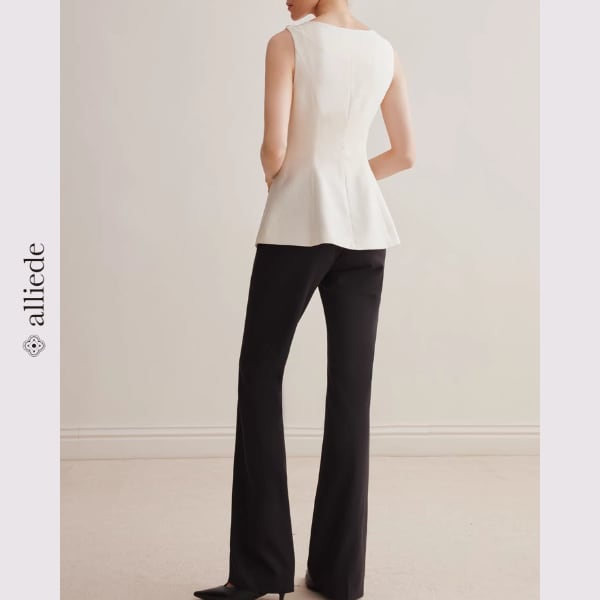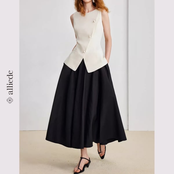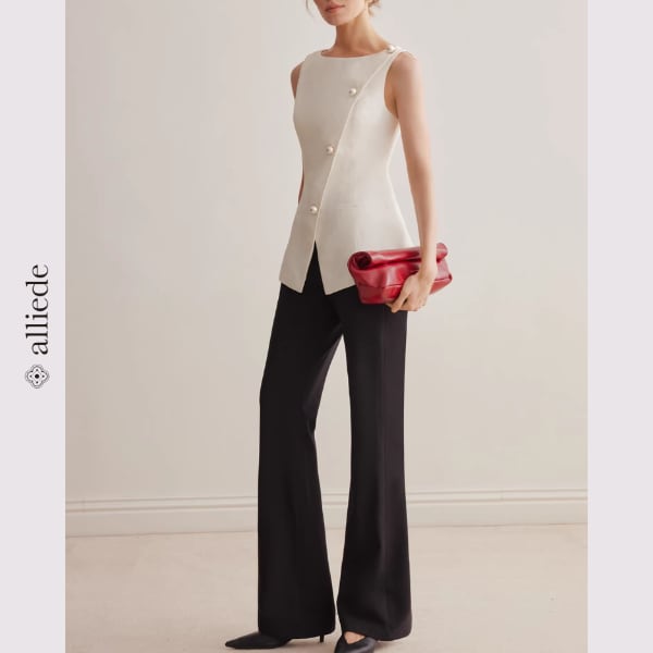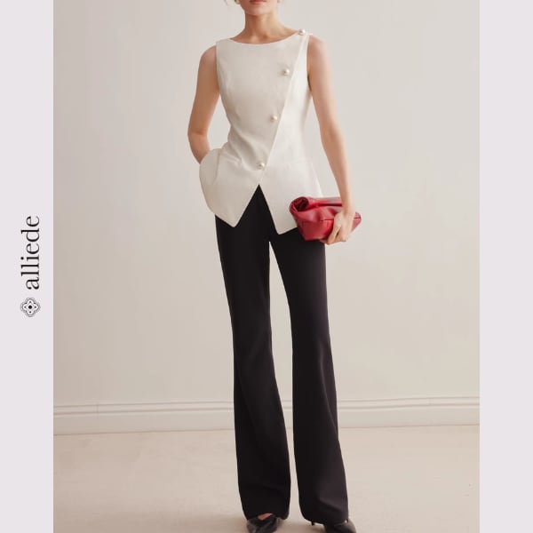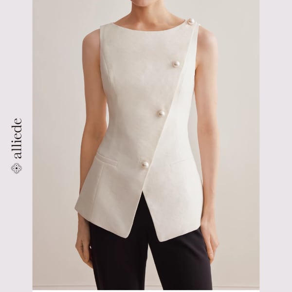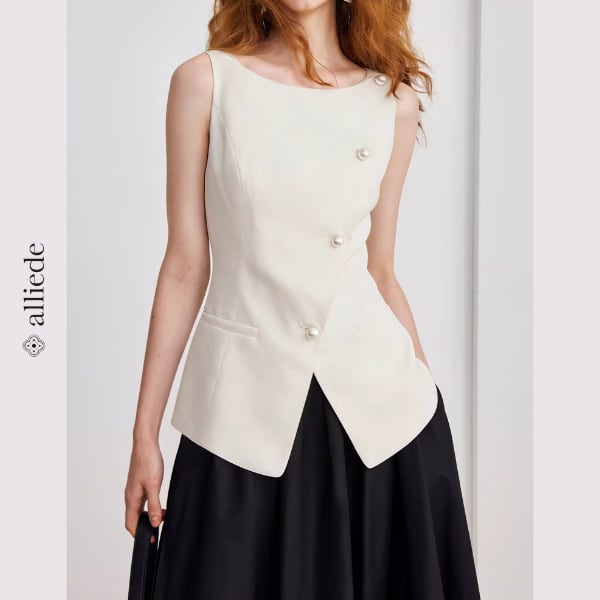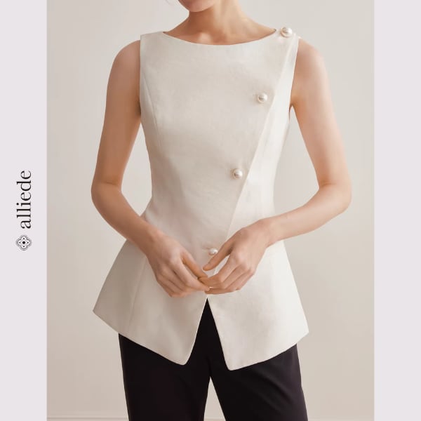 斜めに配置されたパールボタンが印象的な、洗練されたノースリーブトップス。美しいシルエットがウエストラインを引き立て、着るだけで上品な大人スタイルに。