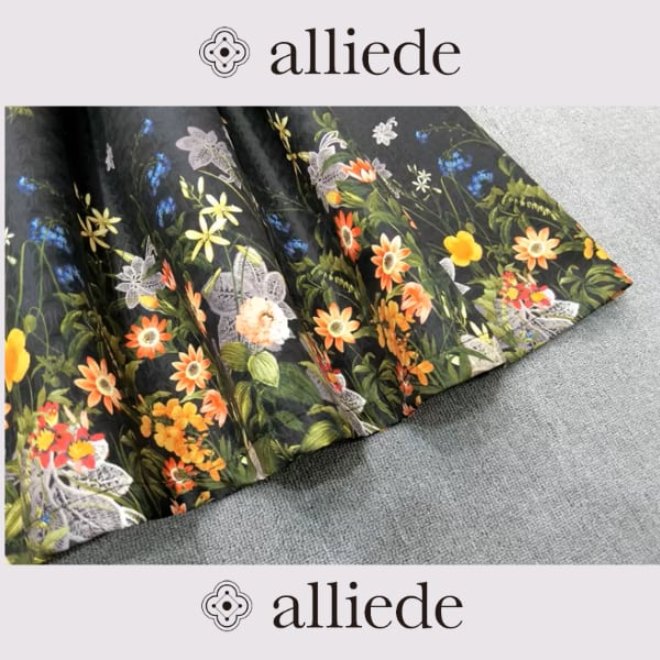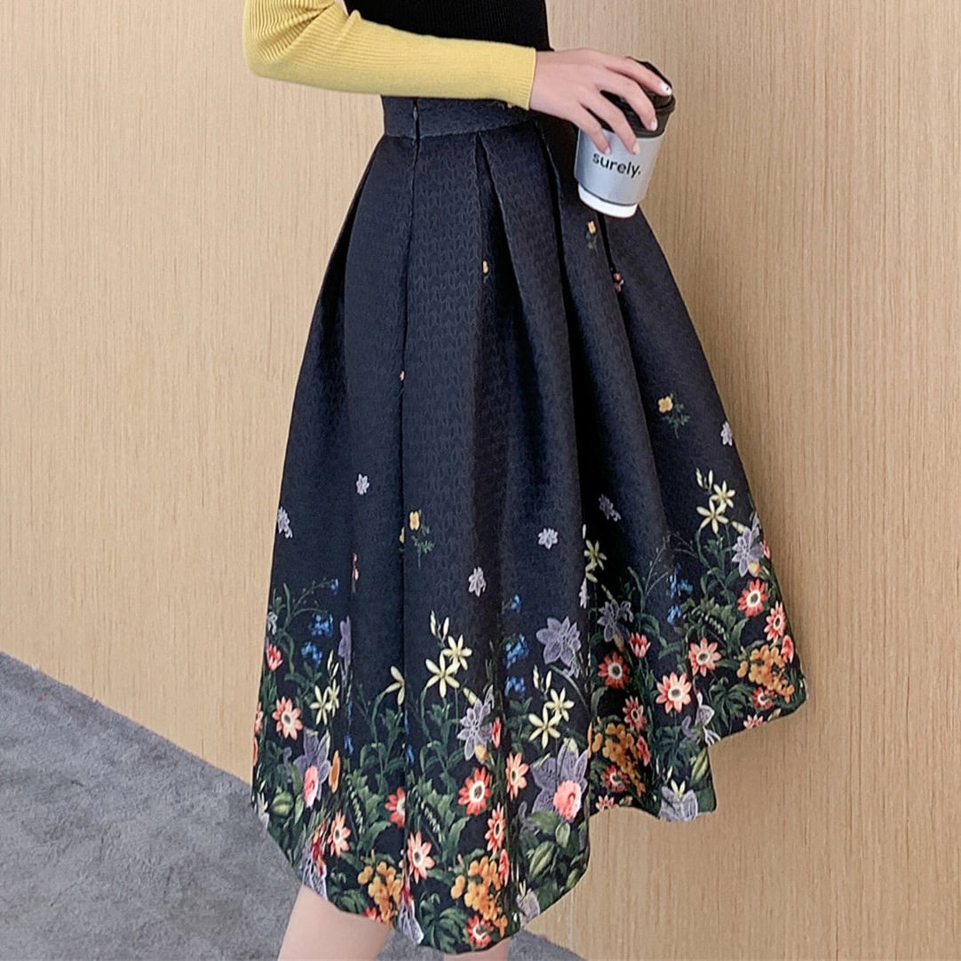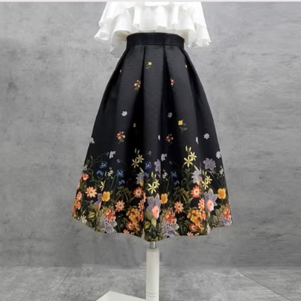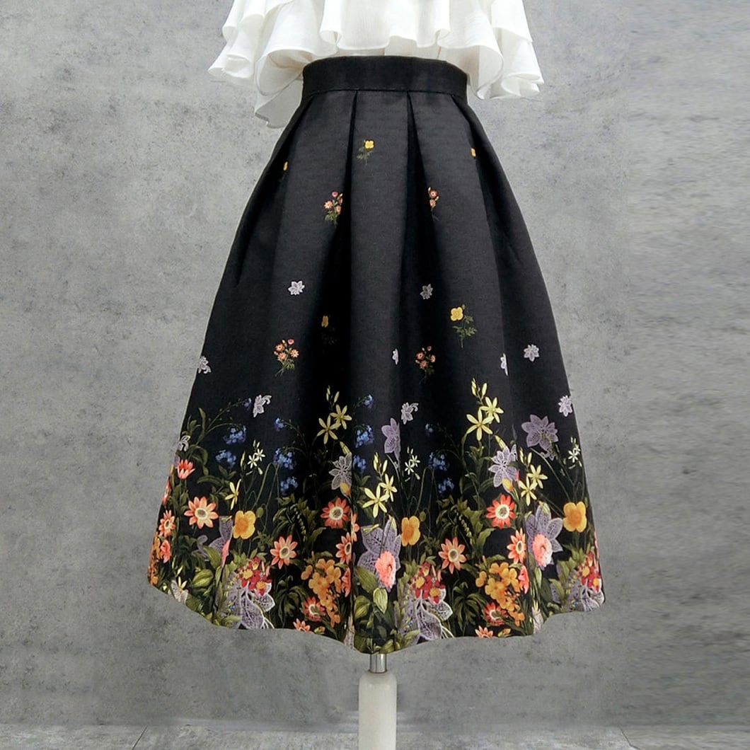 裾に広がる繊細なフラワープリントが印象的なフレアスカート。ベースは落ち着いたカラーで甘さを抑えつつ、華やかさをプラス。