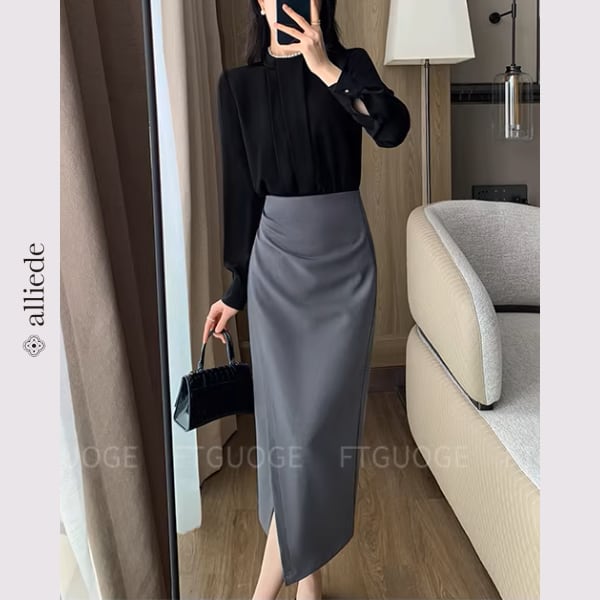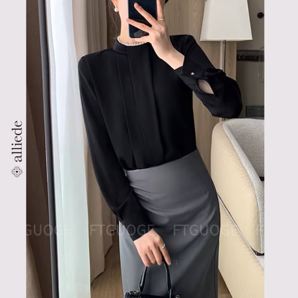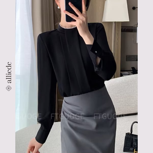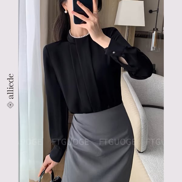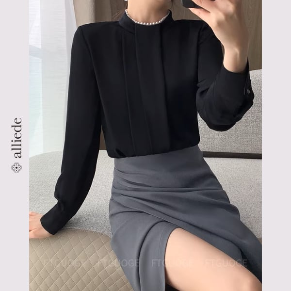 首元にあしらわれたパールデザインが印象的なハイネックブラウス。フロントの縦ラインがすっきりとした印象を演出し、ジャケットインにも映える一枚。