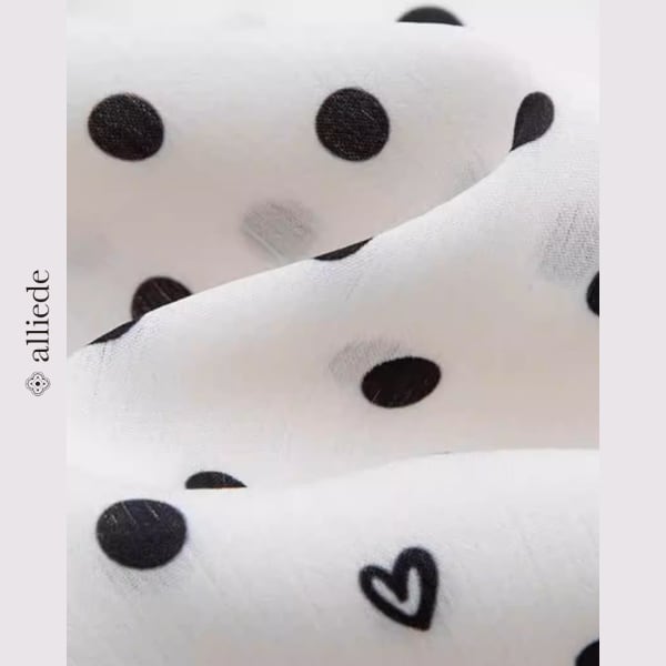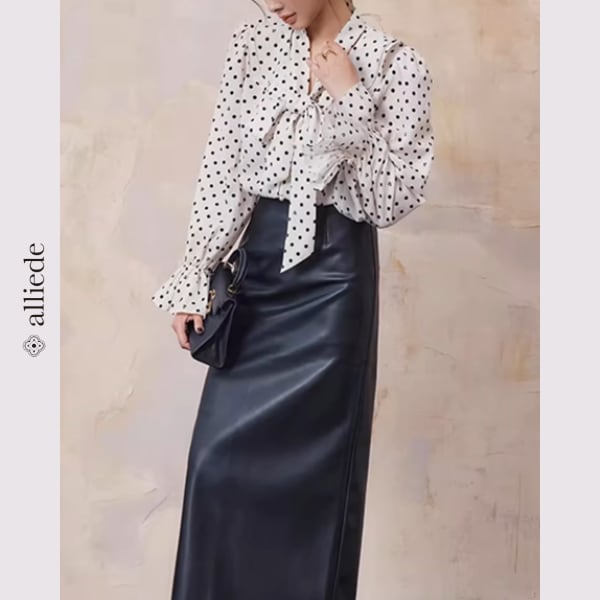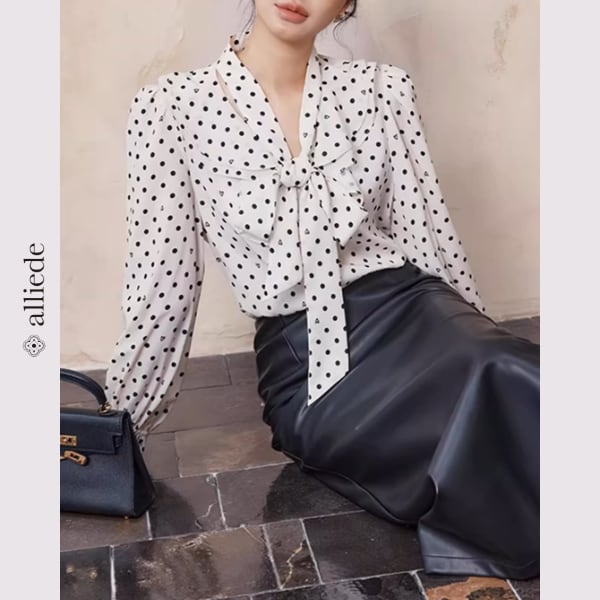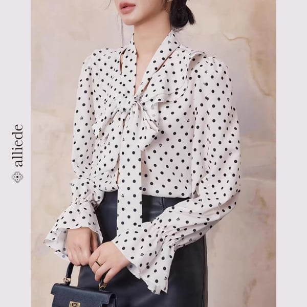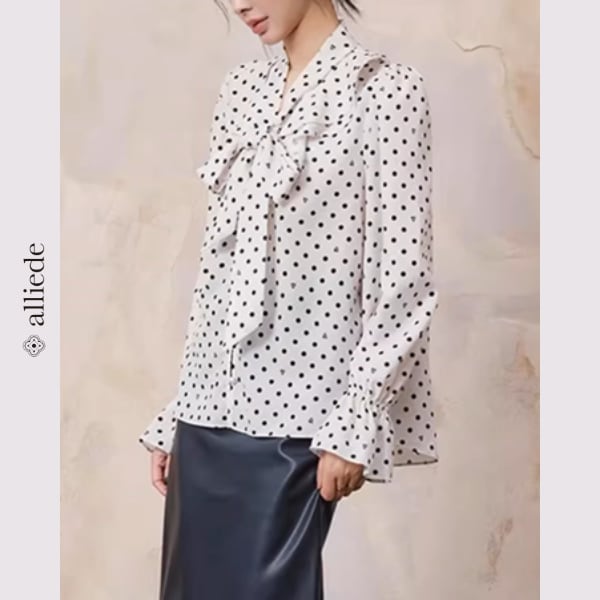 ドット柄にさりげなくハートモチーフを散りばめた遊び心のあるブラウス。リボンタイが顔まわりを華やかに演出し、女性らしい印象に仕上げます。