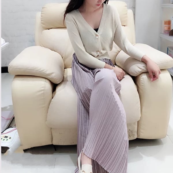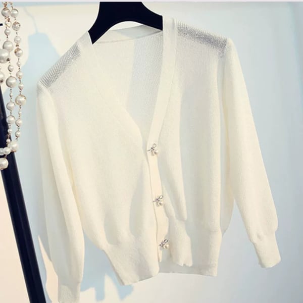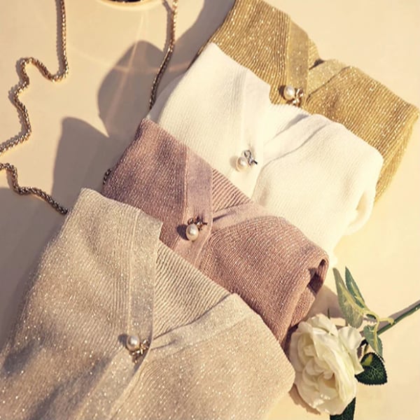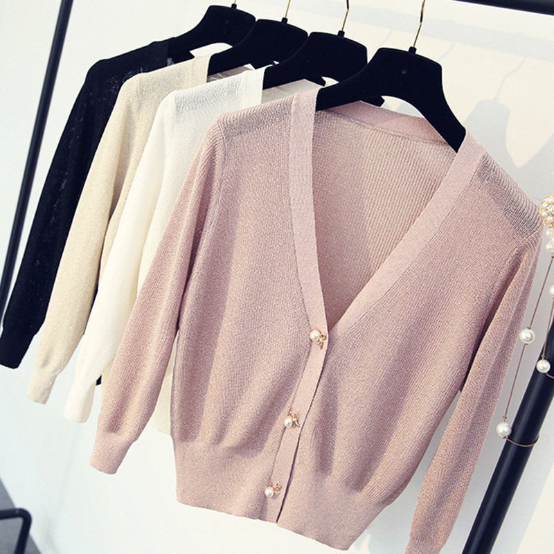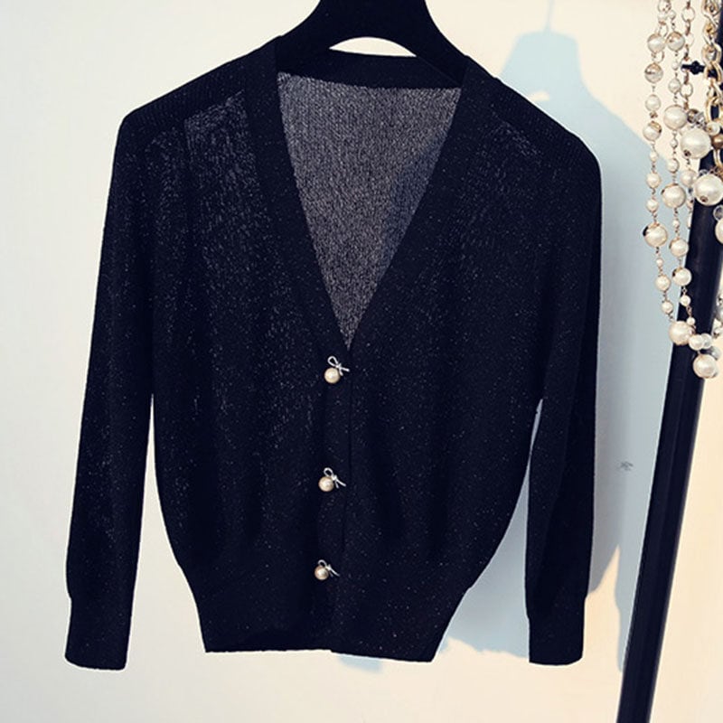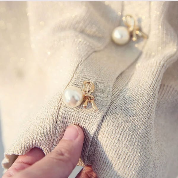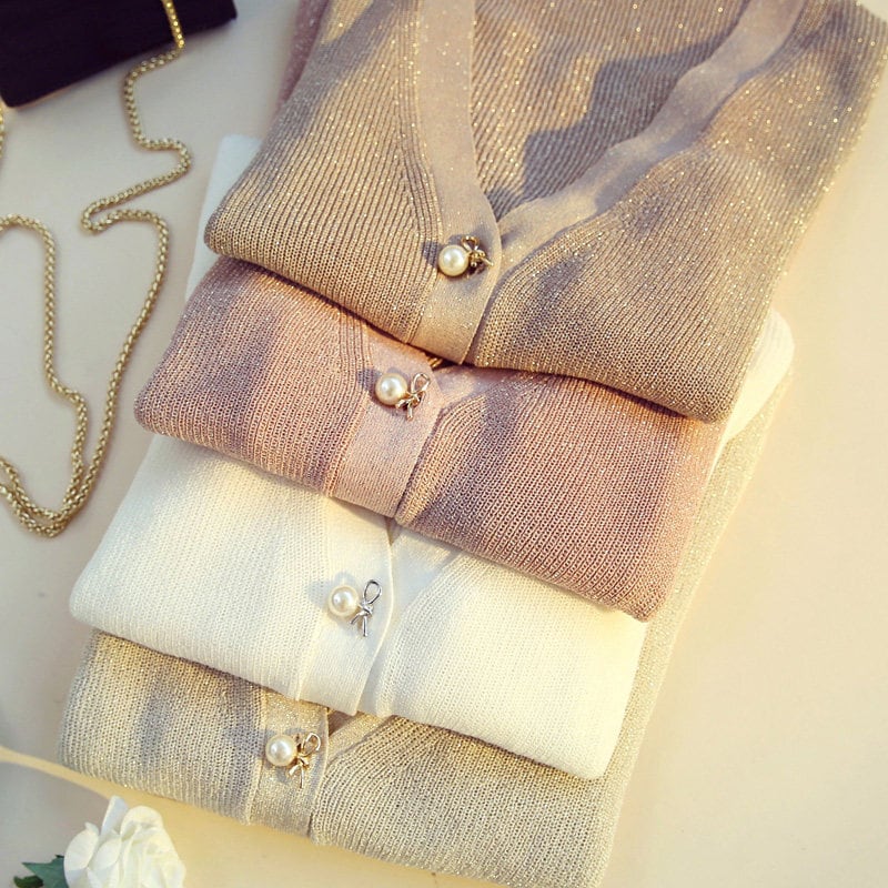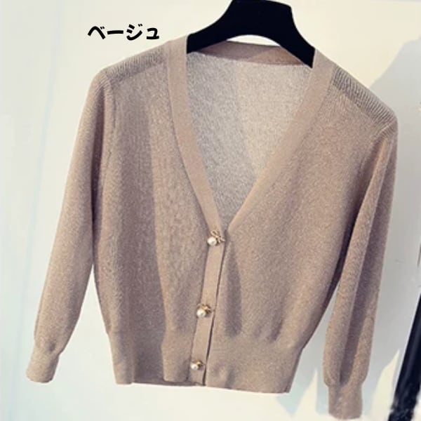 さりげなく輝くラメ感と上品なパールボタンが、大人の女性らしさを静かに引き立てます。羽織るだけで着こなしに品と華やぎをプラスできる、春夏のマストハブアイテムです。