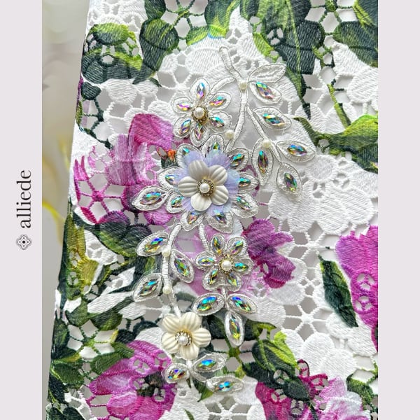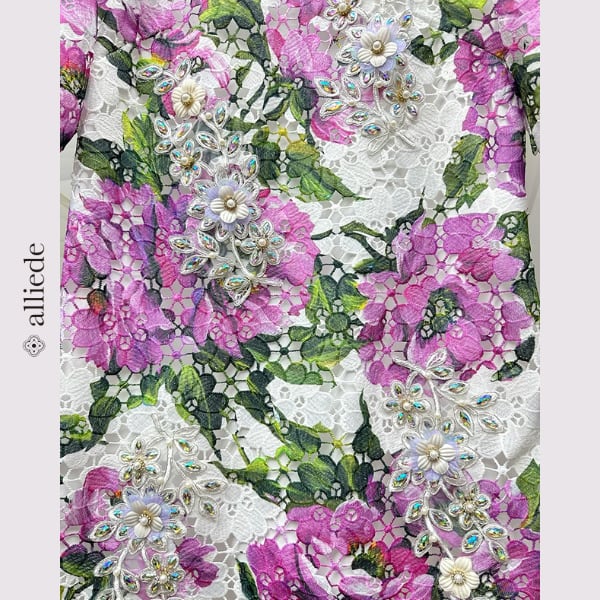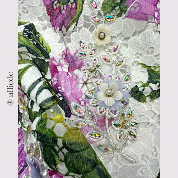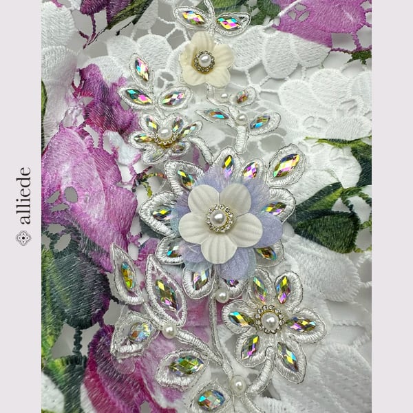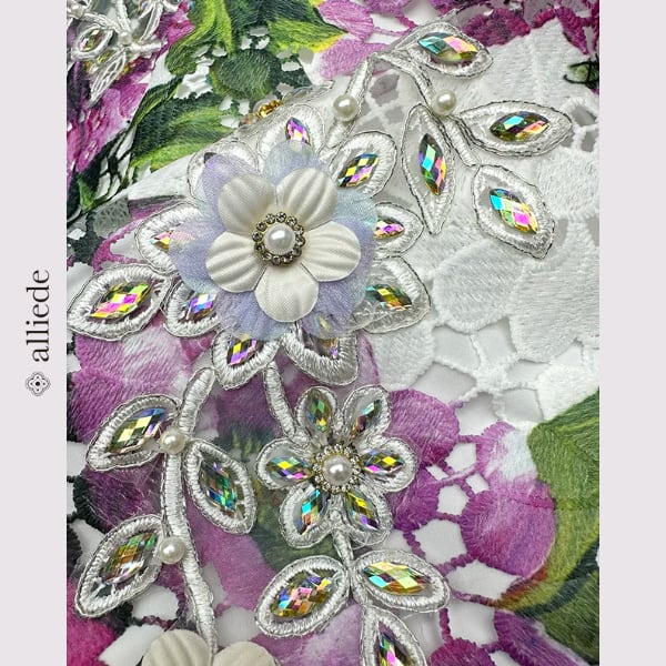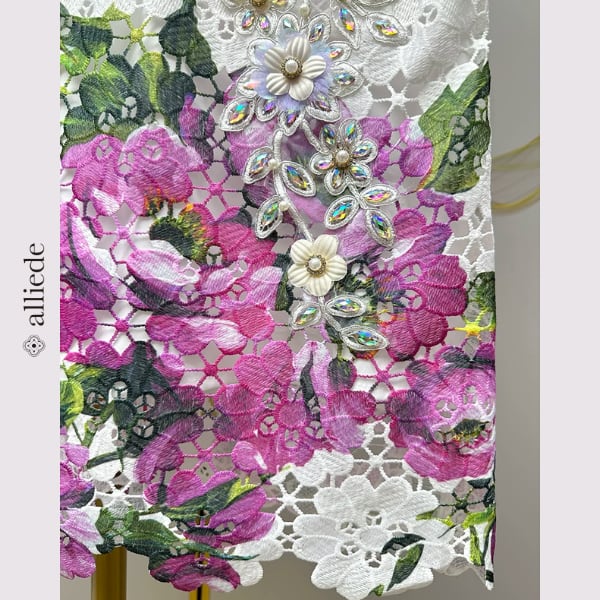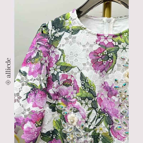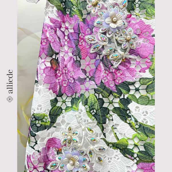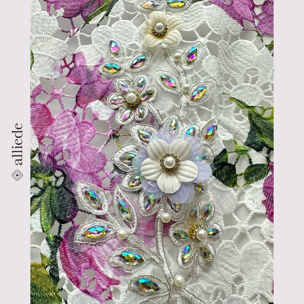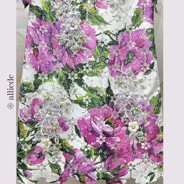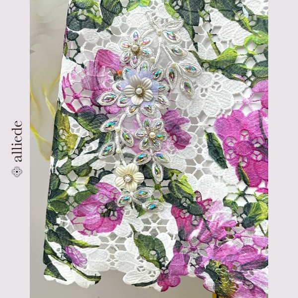 華やかなフラワーレースに立体的なビジュー装飾をあしらった存在感のある一着。繊細な刺繍と輝きが上品な印象を演出し、着るだけで華やかなスタイルが完成。特別な日のお出かけにも映えるワンピースです。