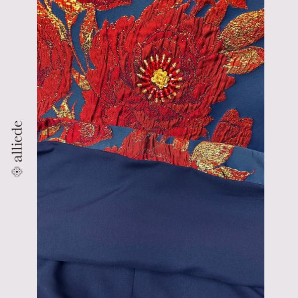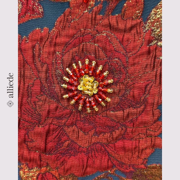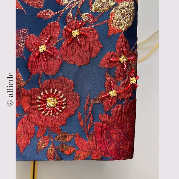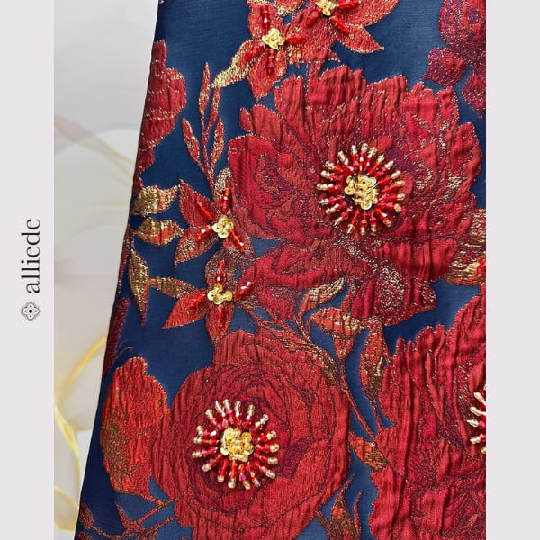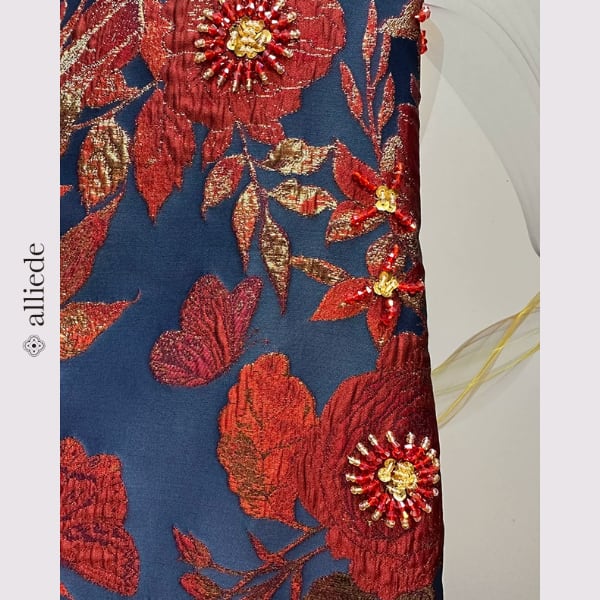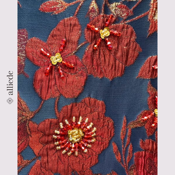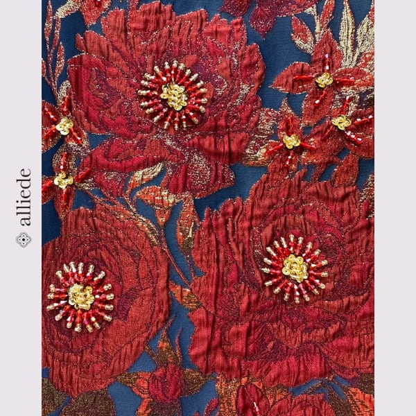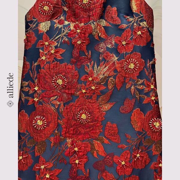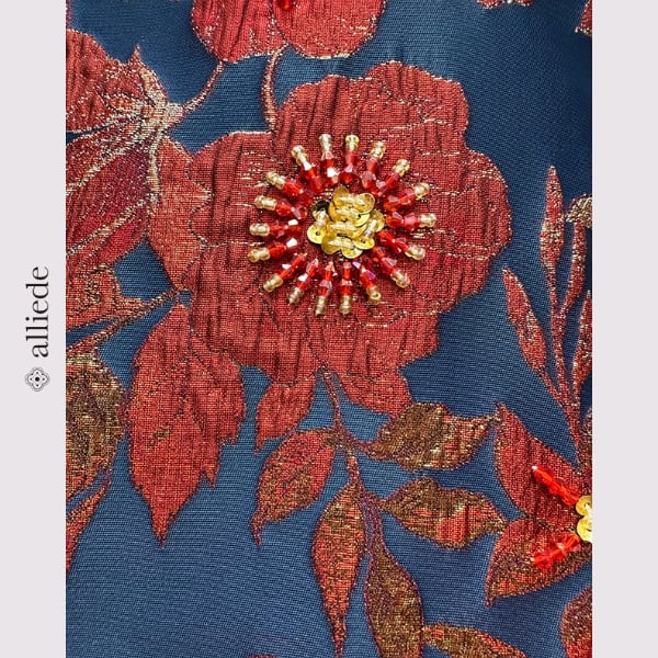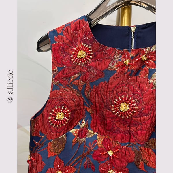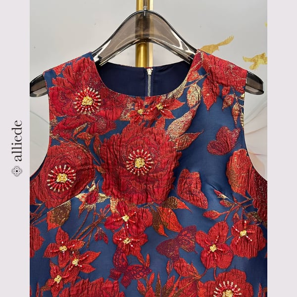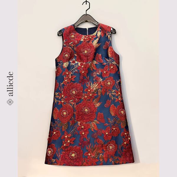 鮮やかなフラワージャカードに繊細なビーズ装飾をあしらった存在感のある一着。立体感のある織りと華やかな配色が目を引き、着るだけで印象的なスタイルに。シンプルなシルエットで上品さも兼ね備えたワンピースです。