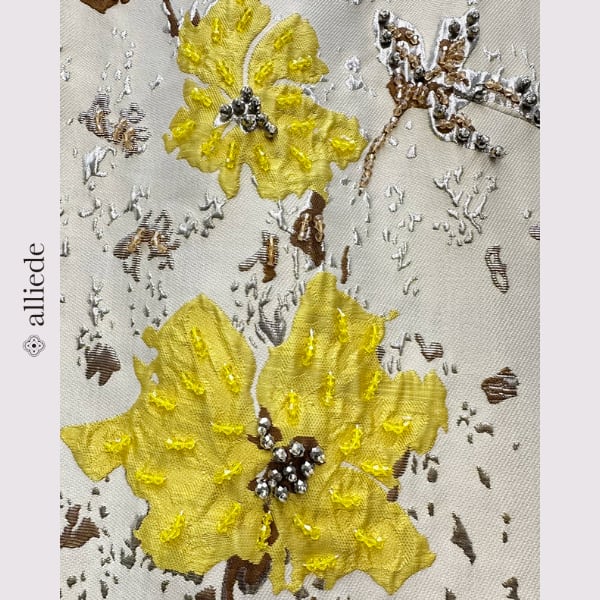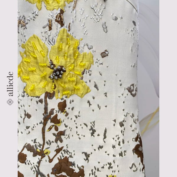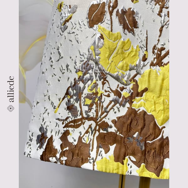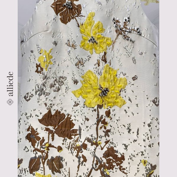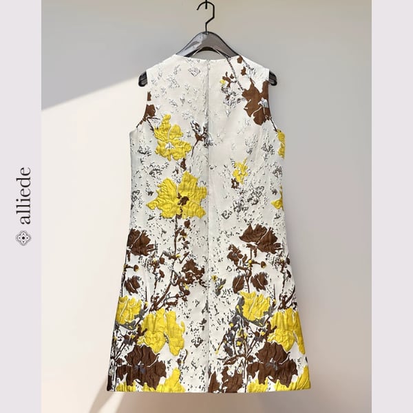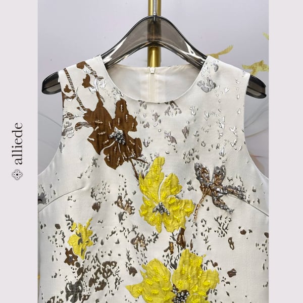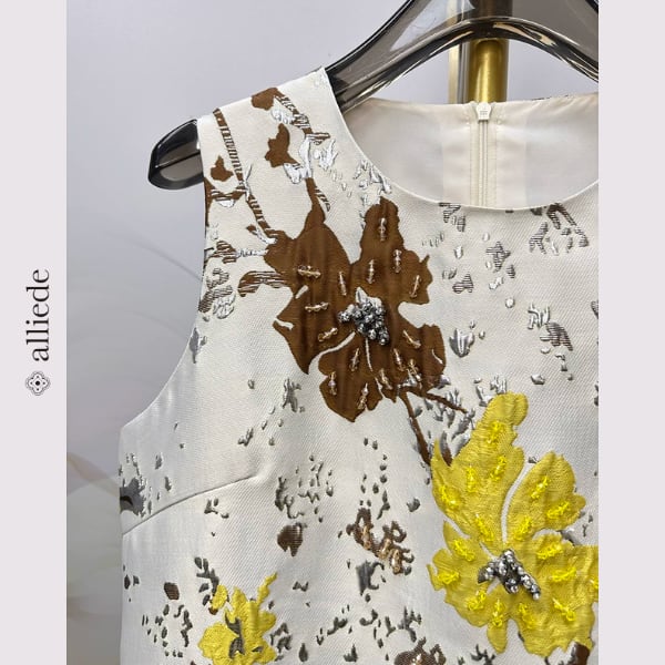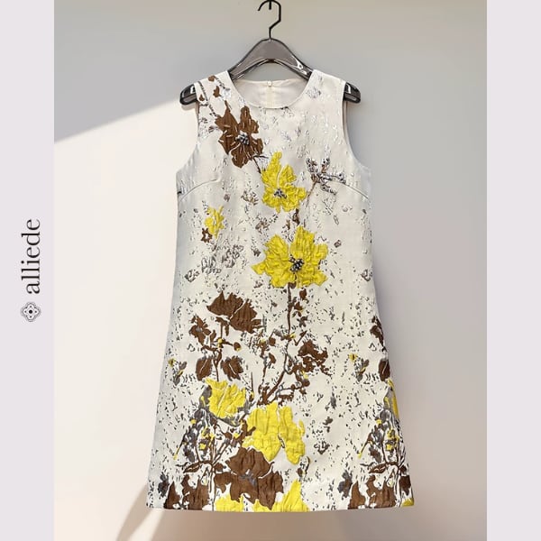 立体感のあるフラワージャカードが目を引くノースリーブワンピース。やわらかな色使いにアクセントカラーが映え、上品で華やかな印象に。すっきりとしたシルエットで一枚でもきれいに着映えする一着です。