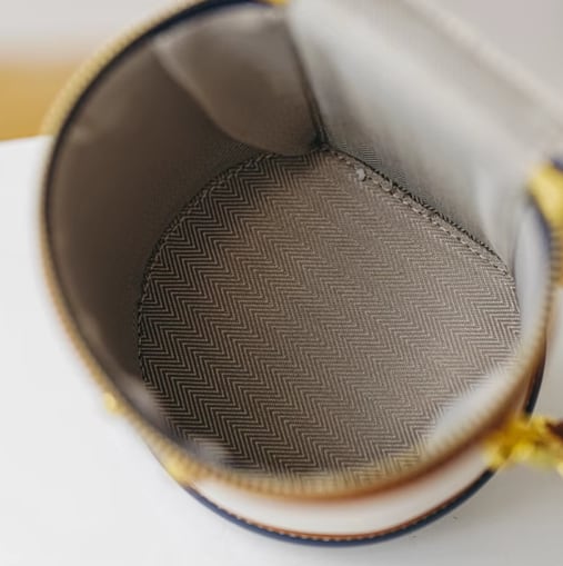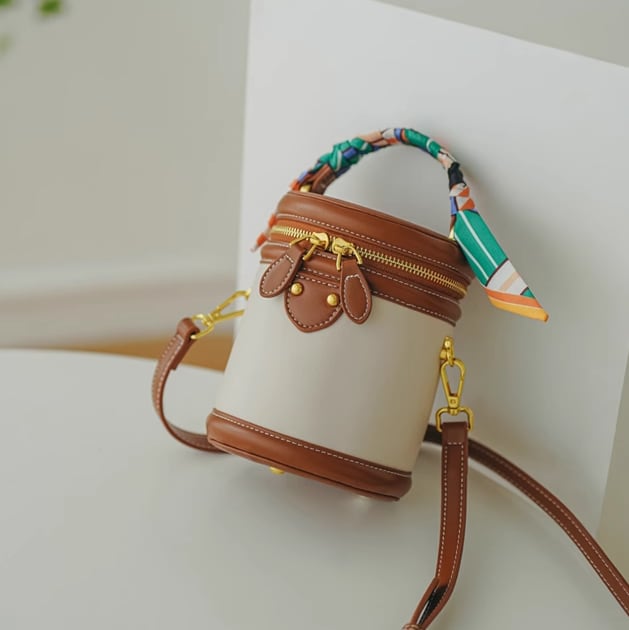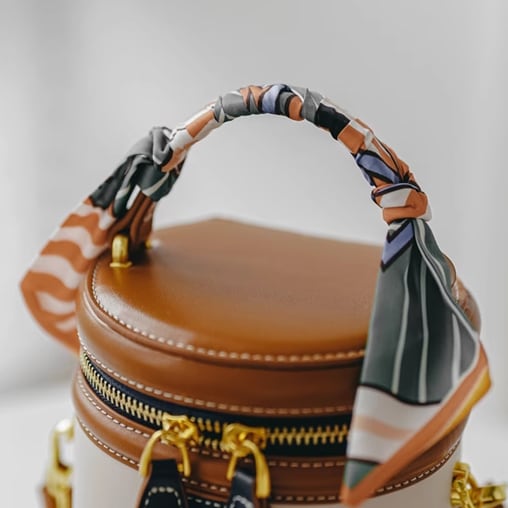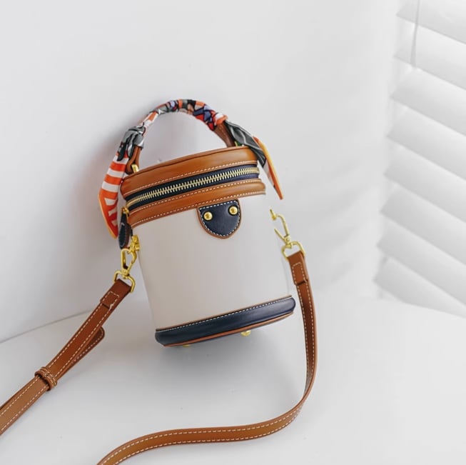 持ち手のスカーフがアクセントになっている小物や財布などを収納できるミニバケットバッグ。