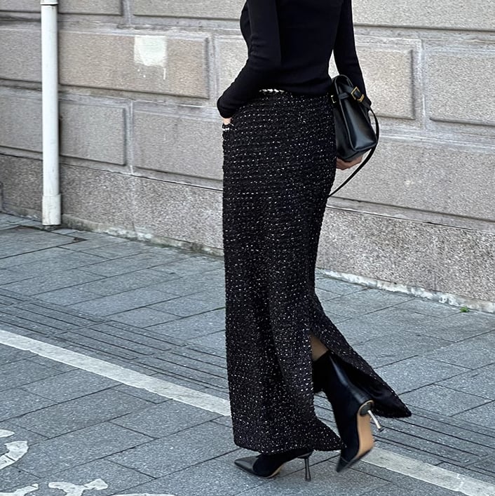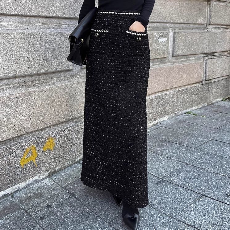 ツイード素材を使用したコントラストスカート。表情豊かなツイードが上品で洗練された印象を演出し、おしゃれな雰囲気を引き立てます。
