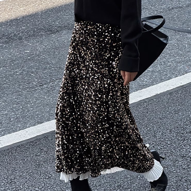 煌めく魅力が溢れるスパンコール切り替えデザインスカート。Aラインシルエットに裾のフリルが可愛らしいアクセントを与え、個性的で派手な印象を演出します。ミドル丈なので、大人っぽく着こなすこともできます。シンプルなトップスとの相性も抜群で、パーティーやイベント、デートなど特別な日にぴったりの一枚です。