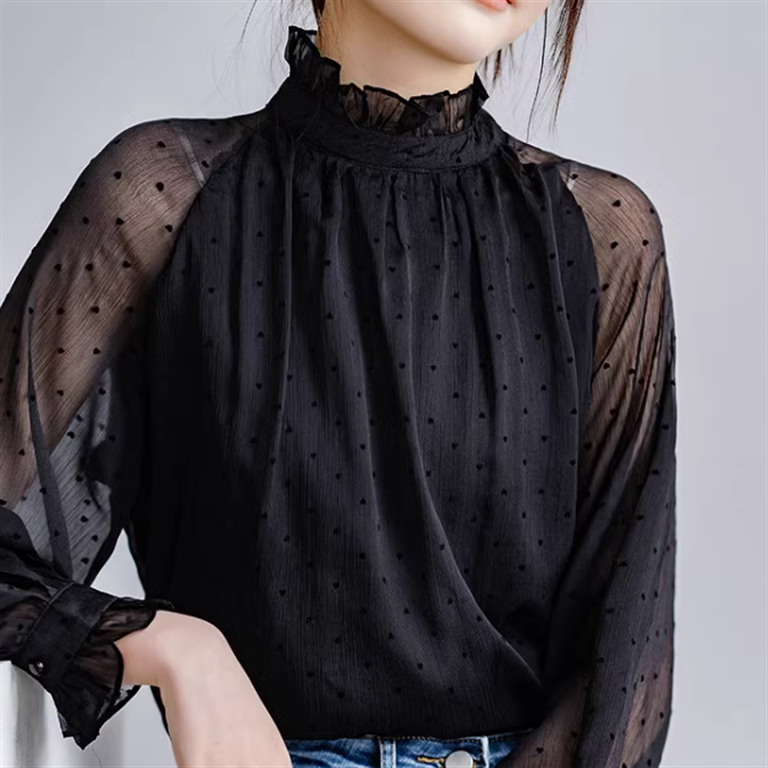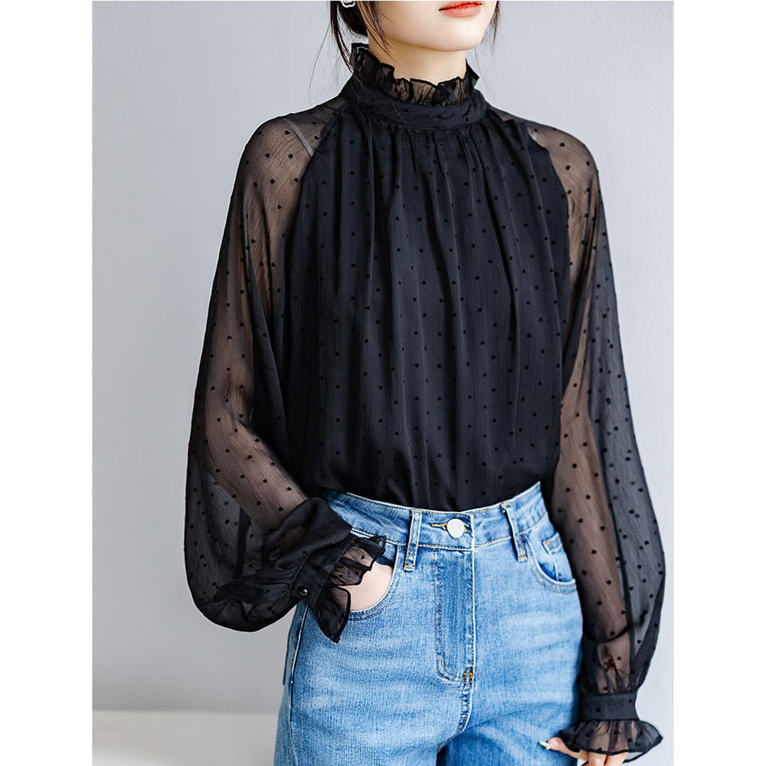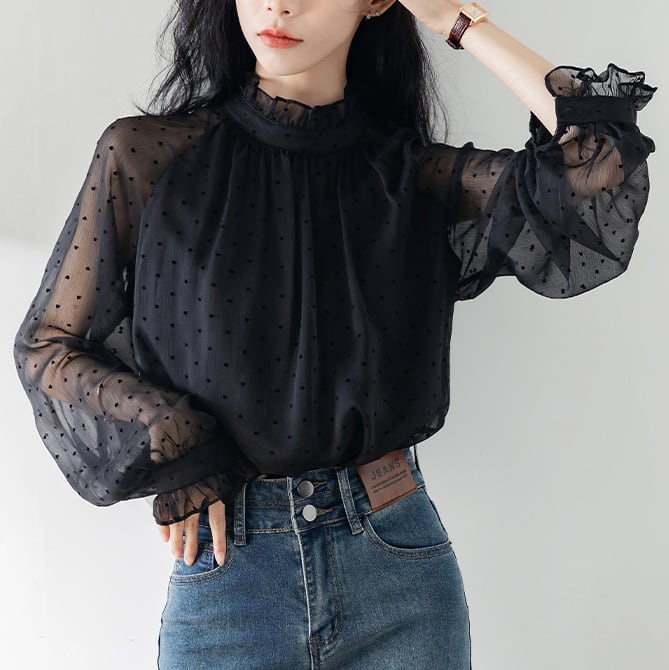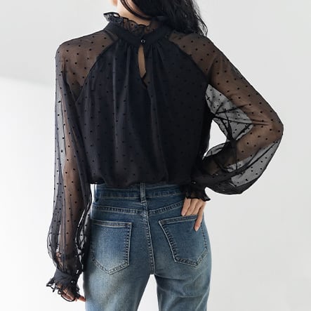 透け感のあるシアー素材と可愛いドット柄が女性らしさを引き立て、ボリューム感のある袖デザインがトレンド感を演出します。フリルのアクセントがよりキュートな印象を与え、ブラックカラーで大人っぽさも兼ね備えています。 【サイズ】 S /着丈 63cm /バスト 98cm /袖丈 72cm M /着丈 64cm /バスト 102cm /袖丈 73cm L /着丈 65cm /バスト 106cm /袖丈 74cm ※1〜3cmの誤差が生じる場合がございます 【素材】 【カラー】 ブラック 【お届けについて】 当ショップはお客様の商品を1点1点検品・梱包をした後、海外からの直接発送となります。 そのため発送までにご決済から3週間前後のお時間を頂いております。 お時間にゆとりを持ってご購入頂くことをおすすめいたします。 ◼️注意事項 ・タイミングによっては商品在庫切れにより注文キャンセルとさせていただく恐れもございますので、予めご了承くださいませ。 ・こちらは輸入品となります。日本製とは検品基準が異なる為、新品未使用品でもごくわずかな汚れやほつれがある場合もございます。 ・仕入れ工場を変えることがあるため、記載サイズと若干異なる場合がございます。 ・商品の色味は、お手持ちのスマートフォンの画面によって実物と若干異なる場合がございます。 ・イメージ違いやサイズ交換等、お客さまご都合による交換、返品は対応出来かねます。 ———————————— ご購入前にこちらをお読みください → https://www.alliede.shop/about ————————————"