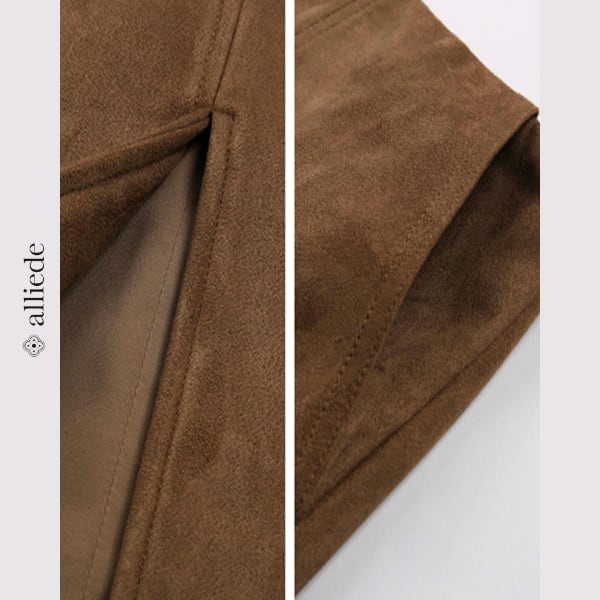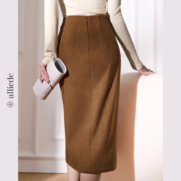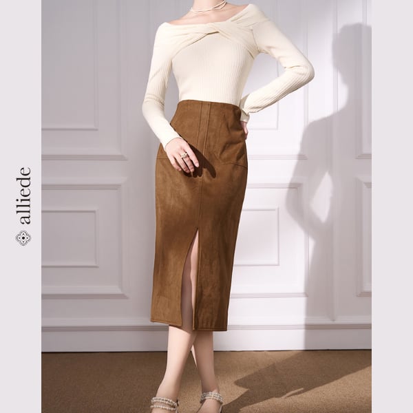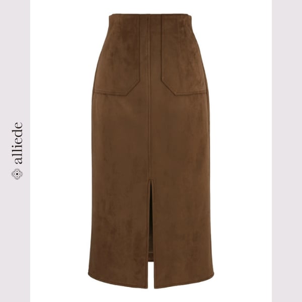 落ち着いたスエード調素材が大人の魅力を引き立てるハイウエストスカート。バックのスリットで動きやすく、スタイルアップ効果も抜群。オンからオフまで幅広く活躍します。